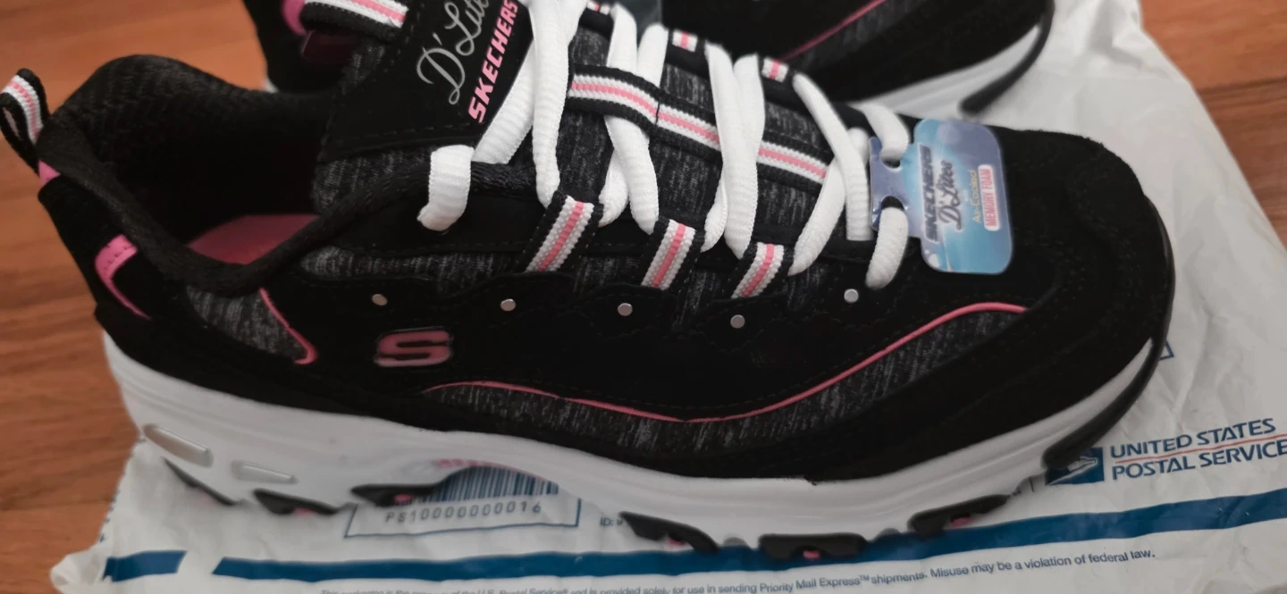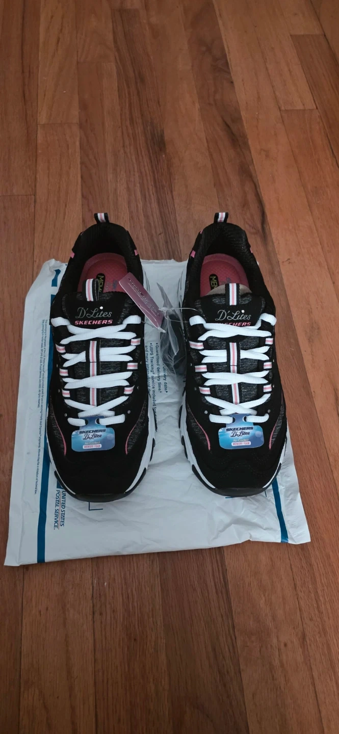 Selling a pair of Skechers D'Lites sneakers for women. They feature air-cooled memory foam for extra comfort. The shoes are black with pink and white accents. Great for everyday wear! No box