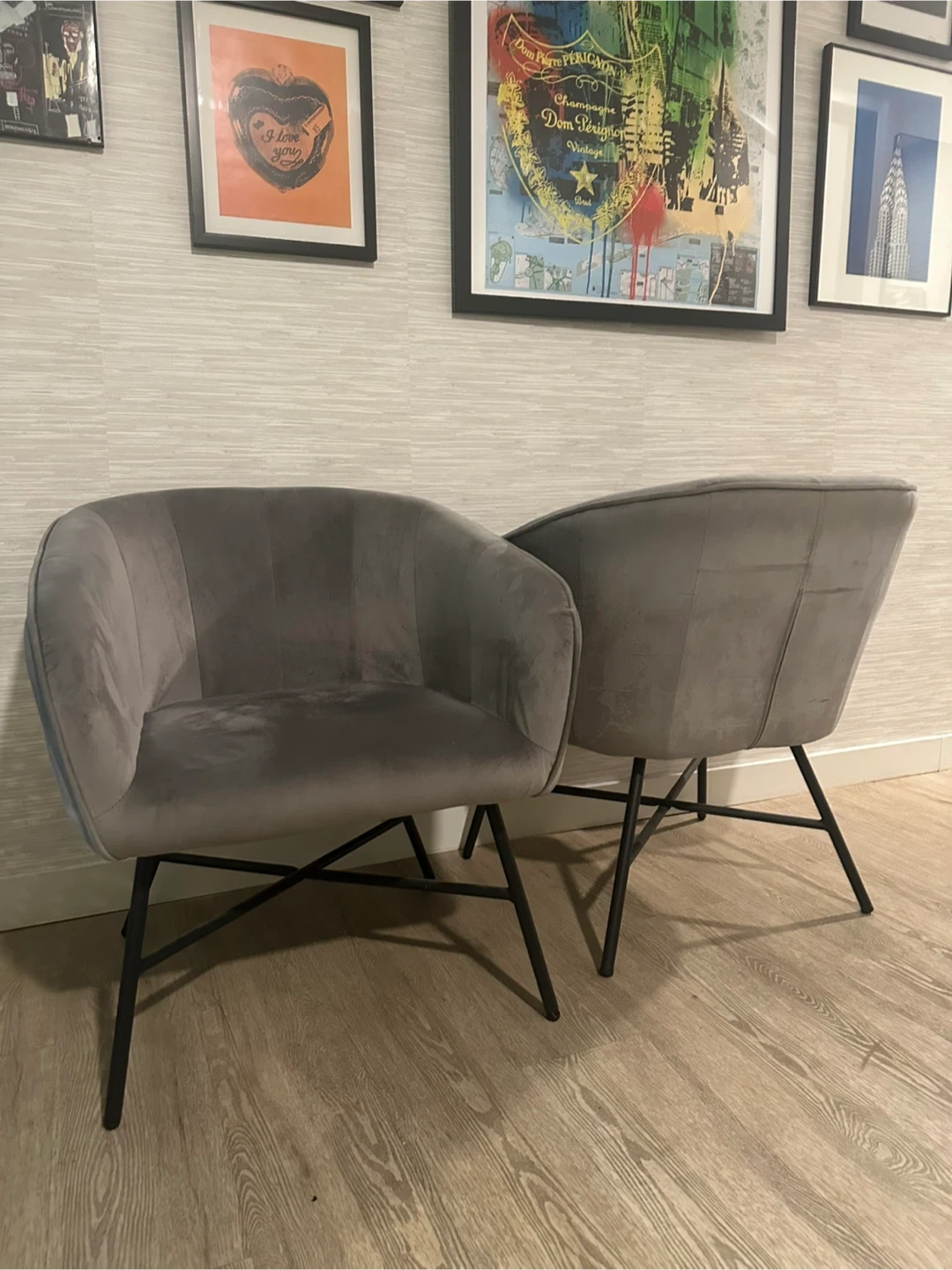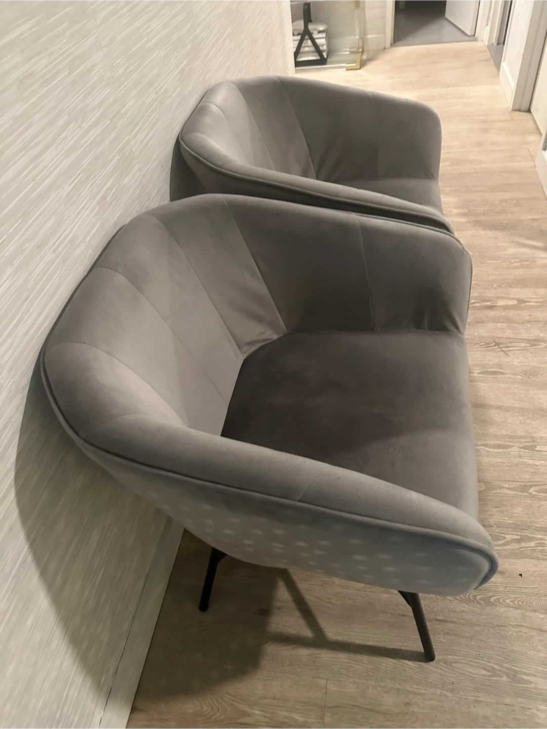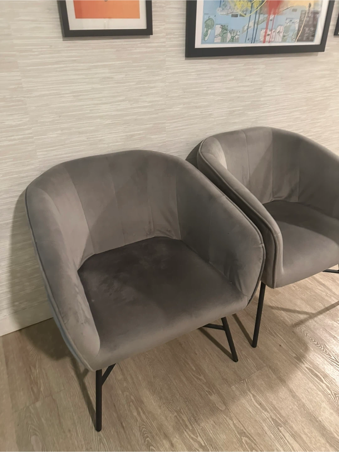 Selling a set of two gray accent chairs. They're in great condition and would look great in any living space! The chairs have a modern design with black metal legs. They are comfortable and stylish, perfect for adding a touch of elegance to your home.