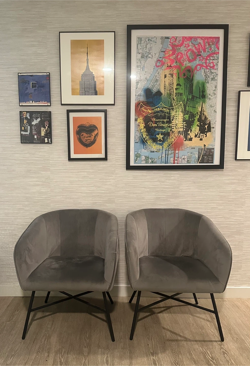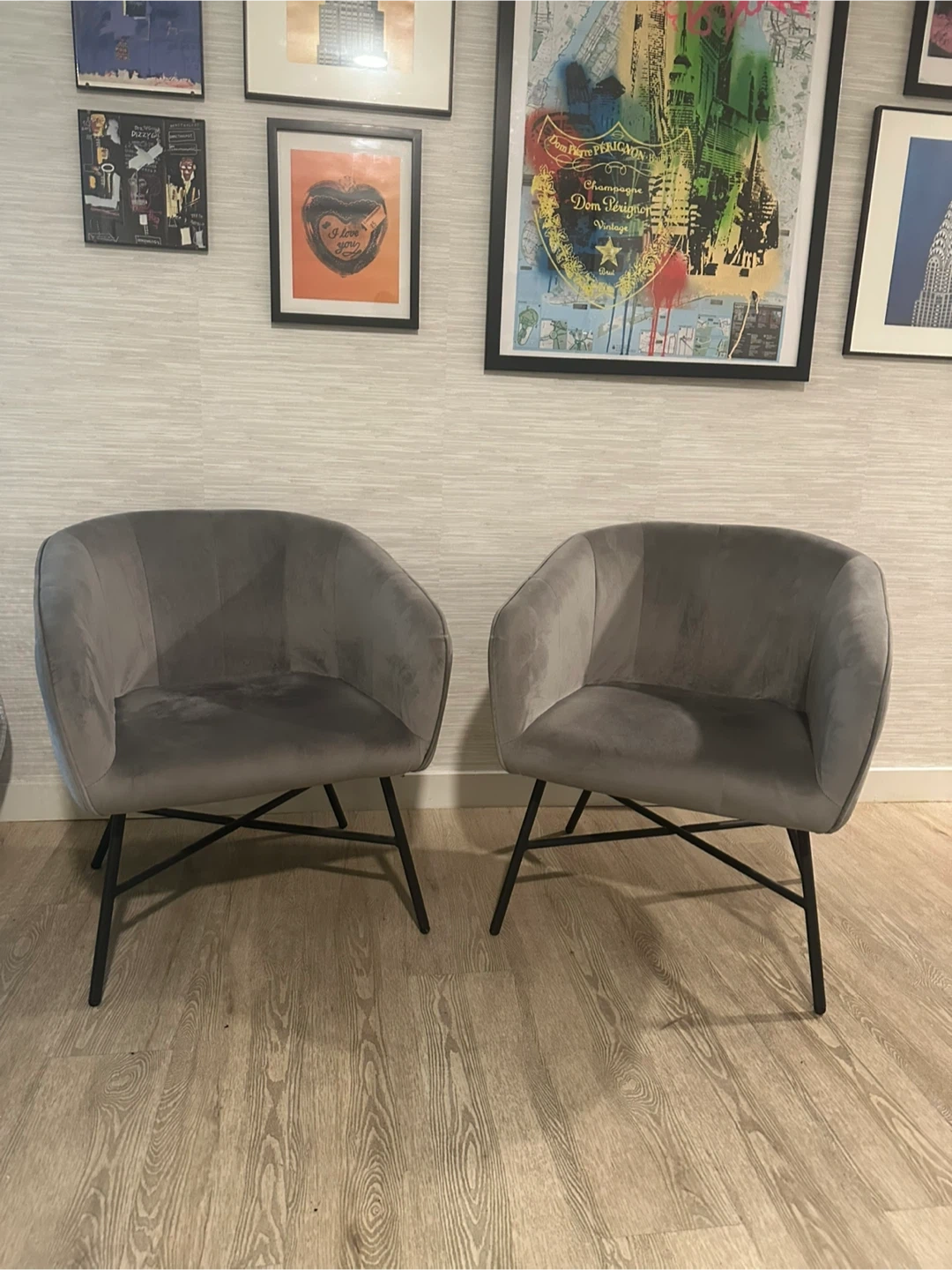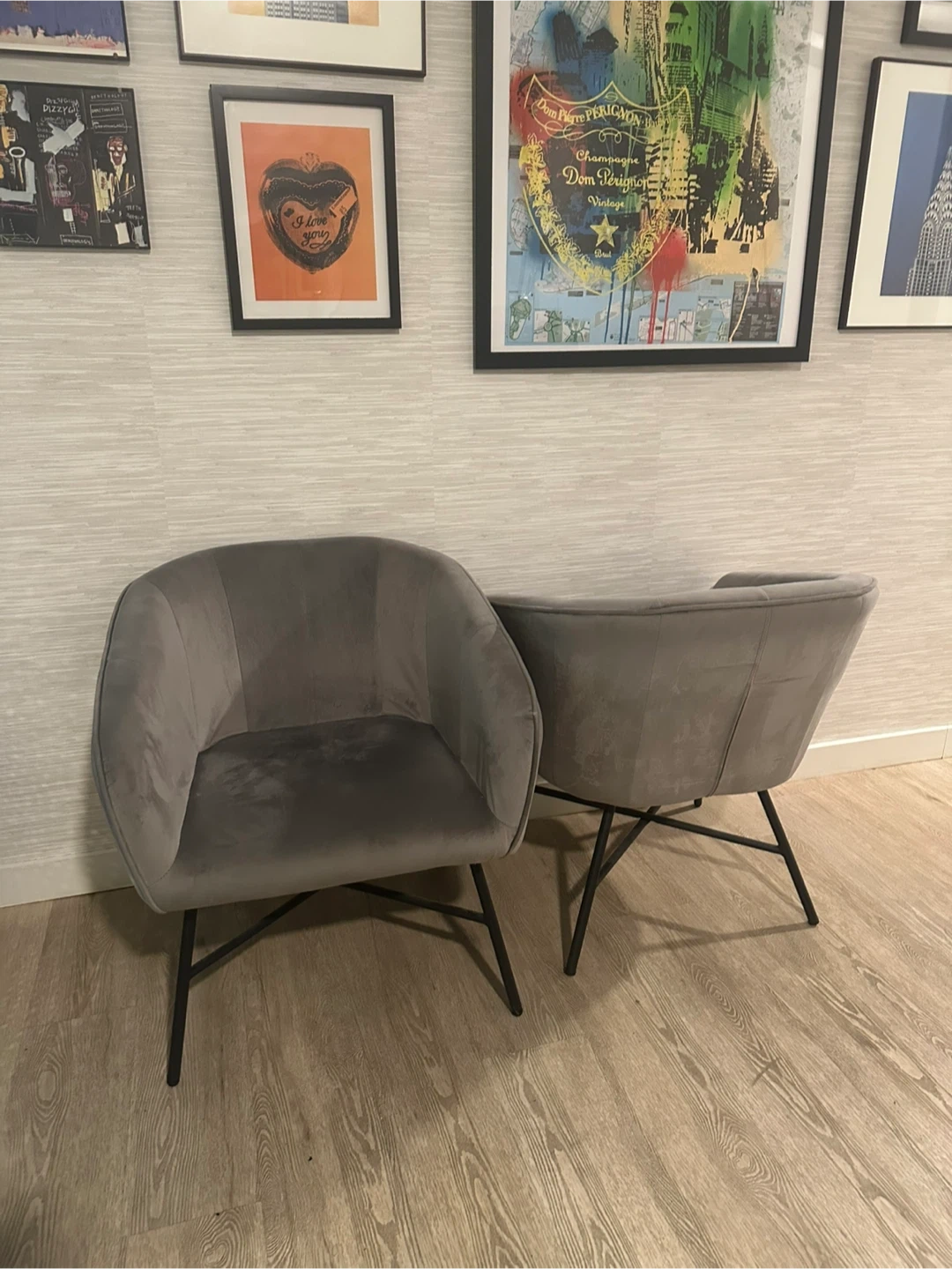 Selling a set of two gray accent chairs. They're in great condition and would look great in any living space! The chairs have a modern design with black metal legs. They are comfortable and stylish, perfect for adding a touch of elegance to your home.