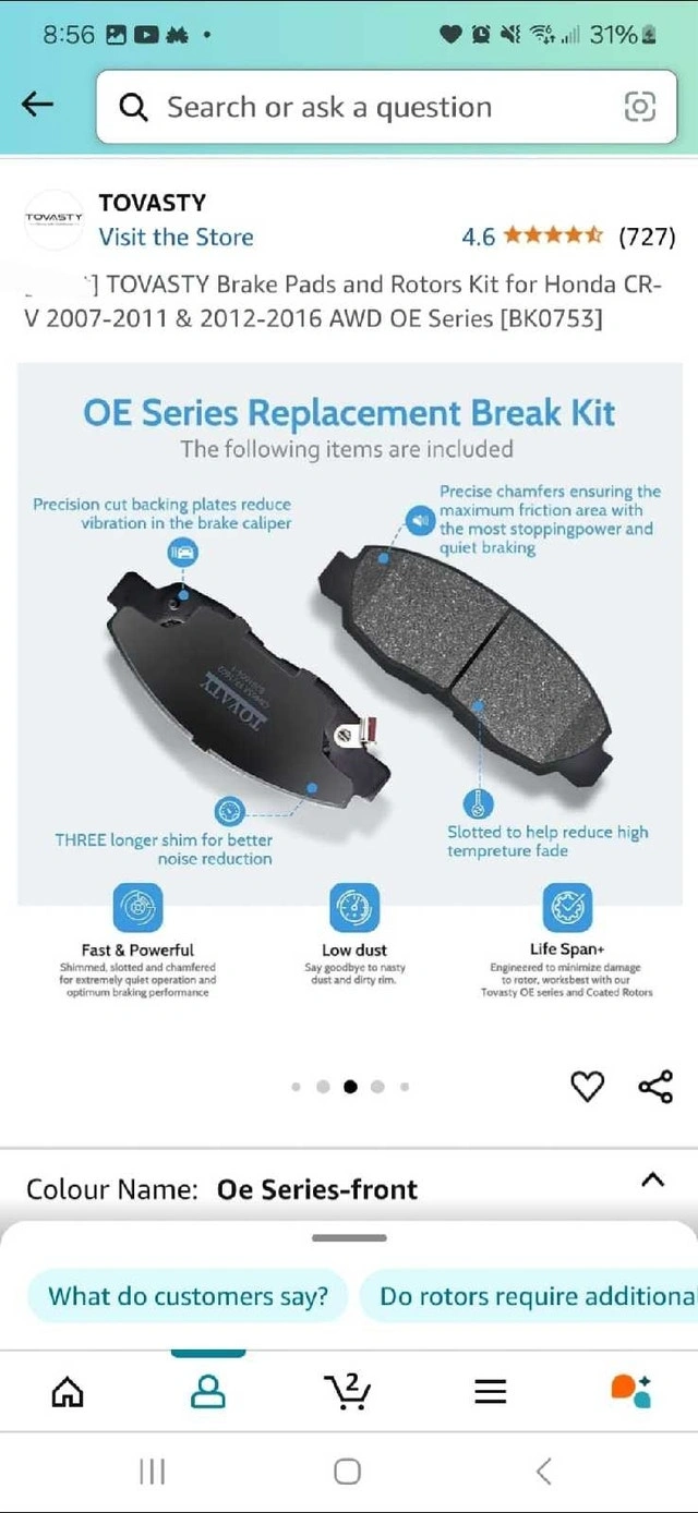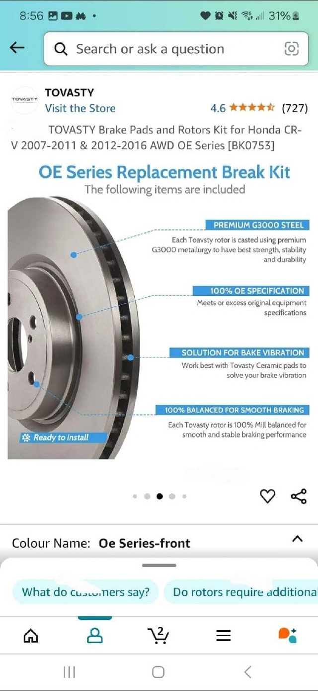 Brand New TOVASTY Rear Brake Pads and Rotors Kit for Honda CR- V 2007-2011 & 2012-2016 AWD OE Series [BK0753]