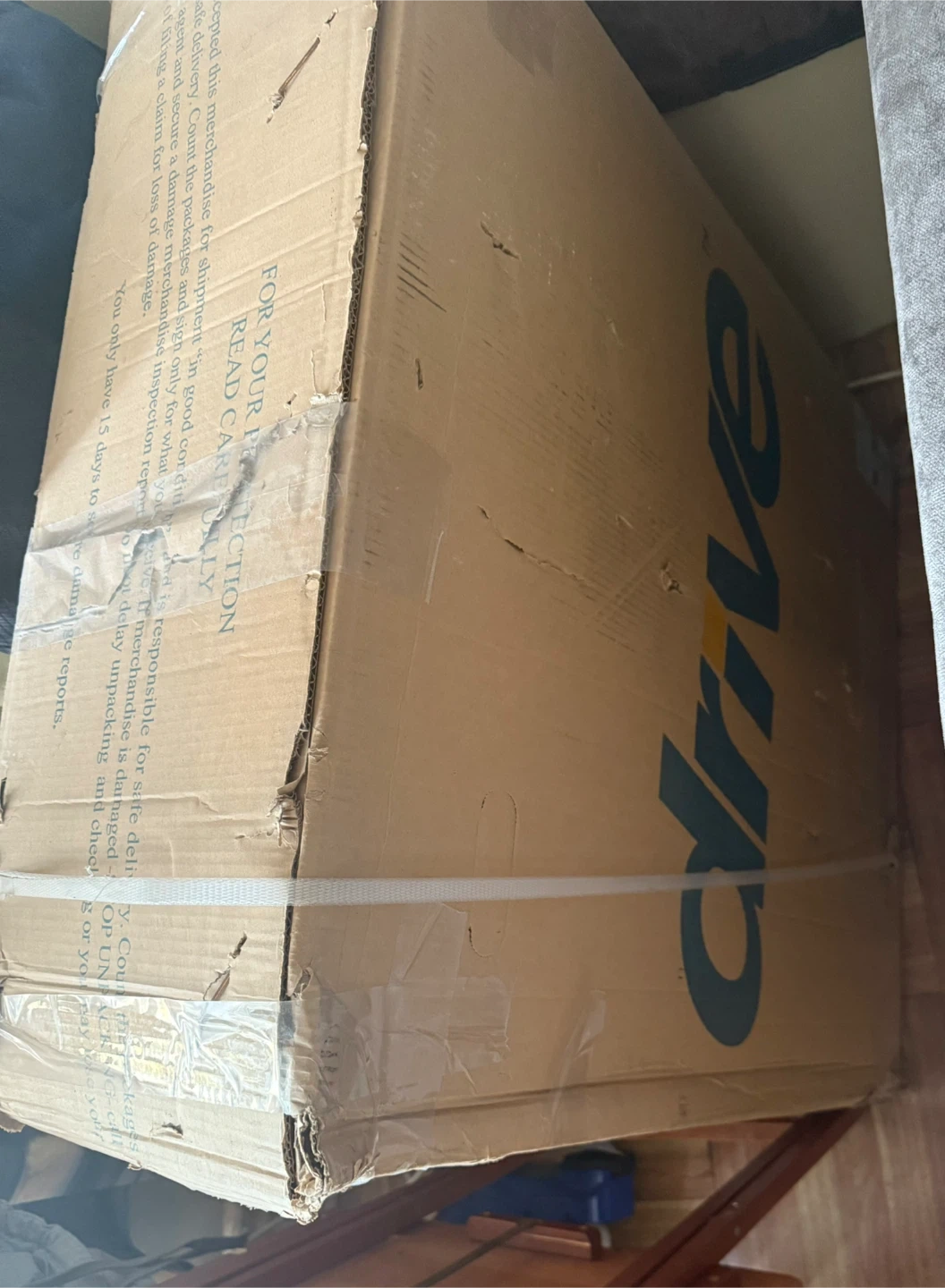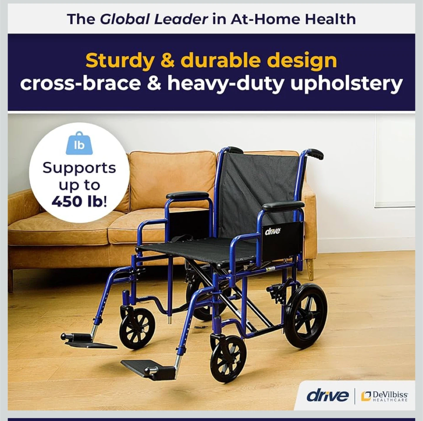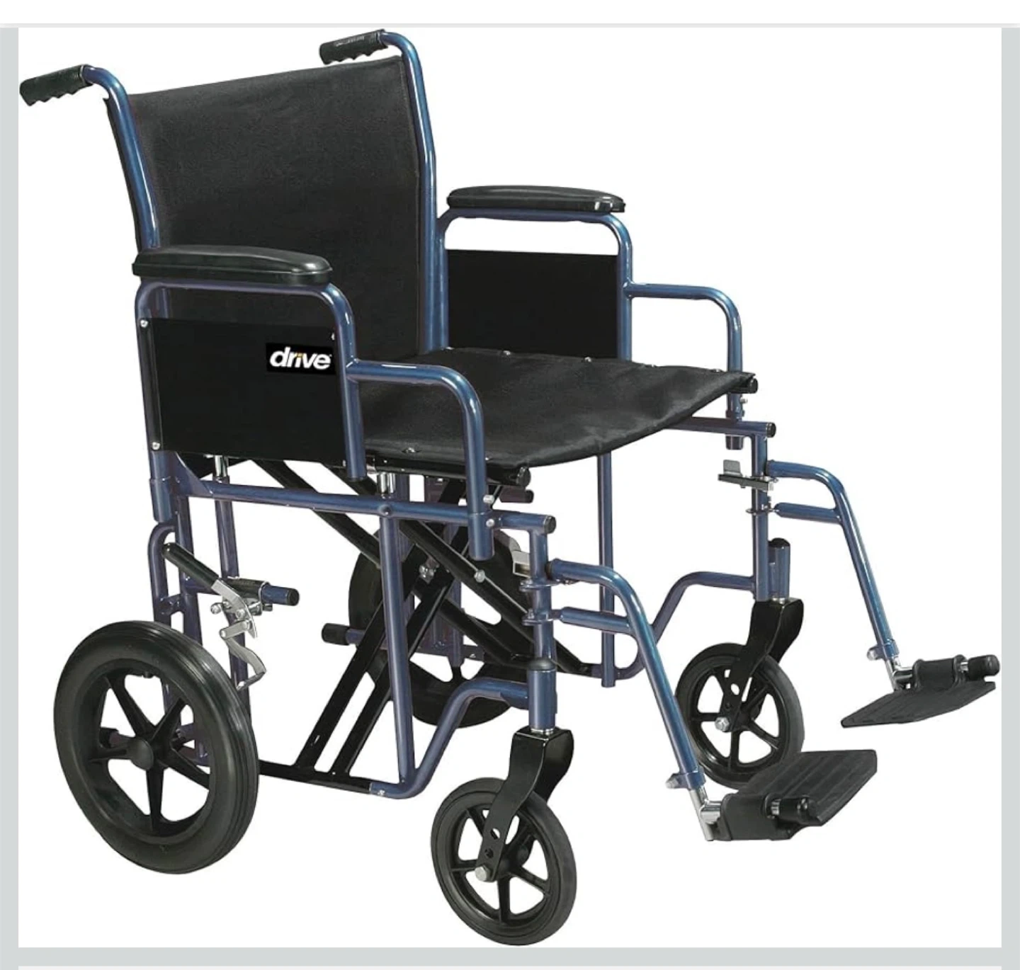 Selling a Drive Medical wheelchair in blue! It features a sturdy and durable design with cross-brace and heavy-duty upholstery. It supports up to 450 lbs. Comes with the original box!