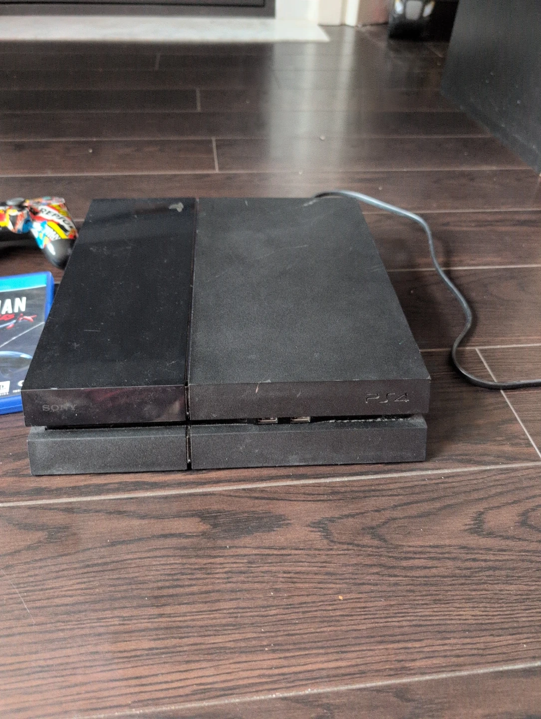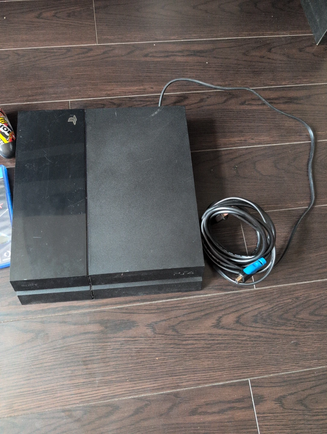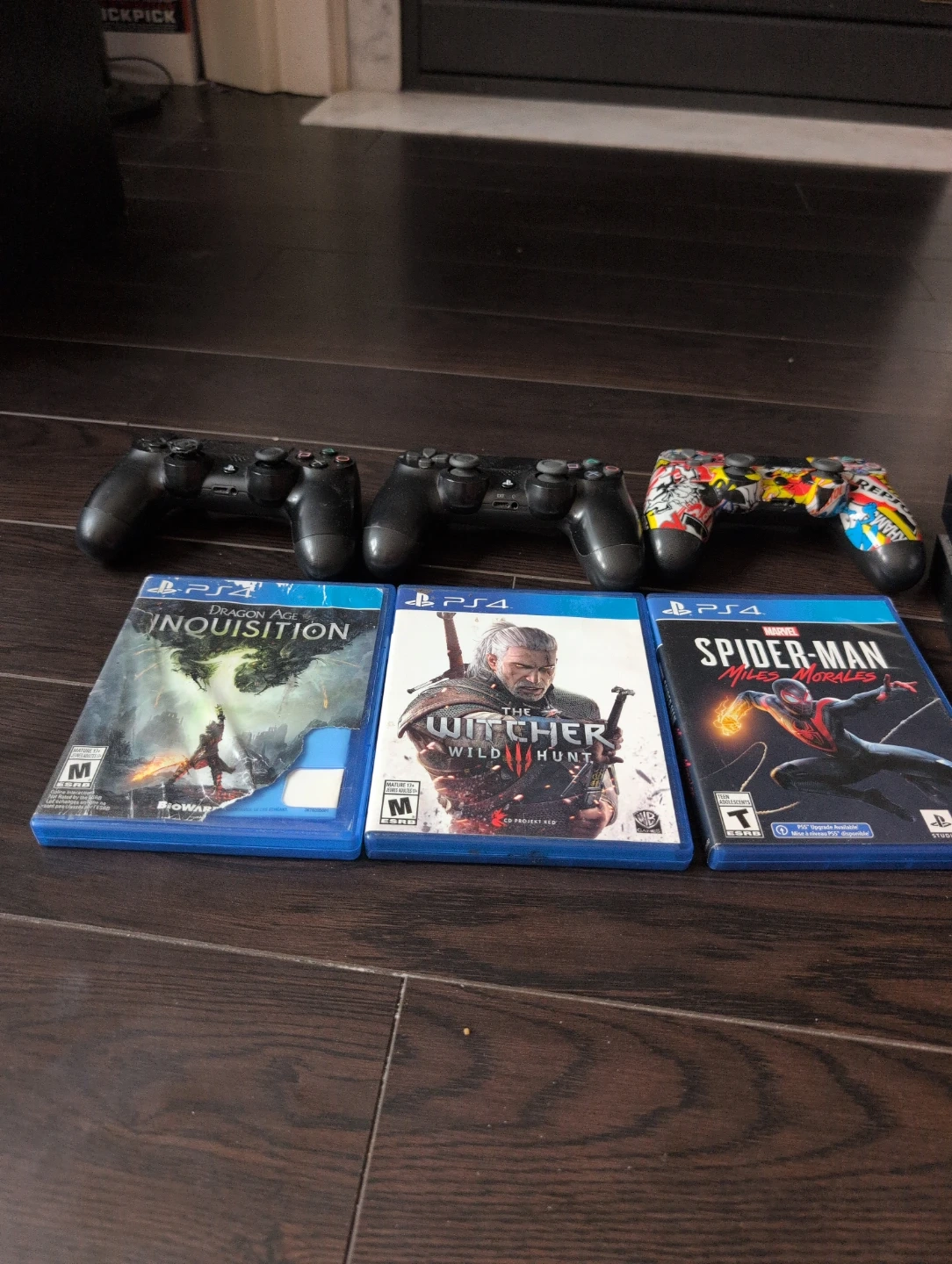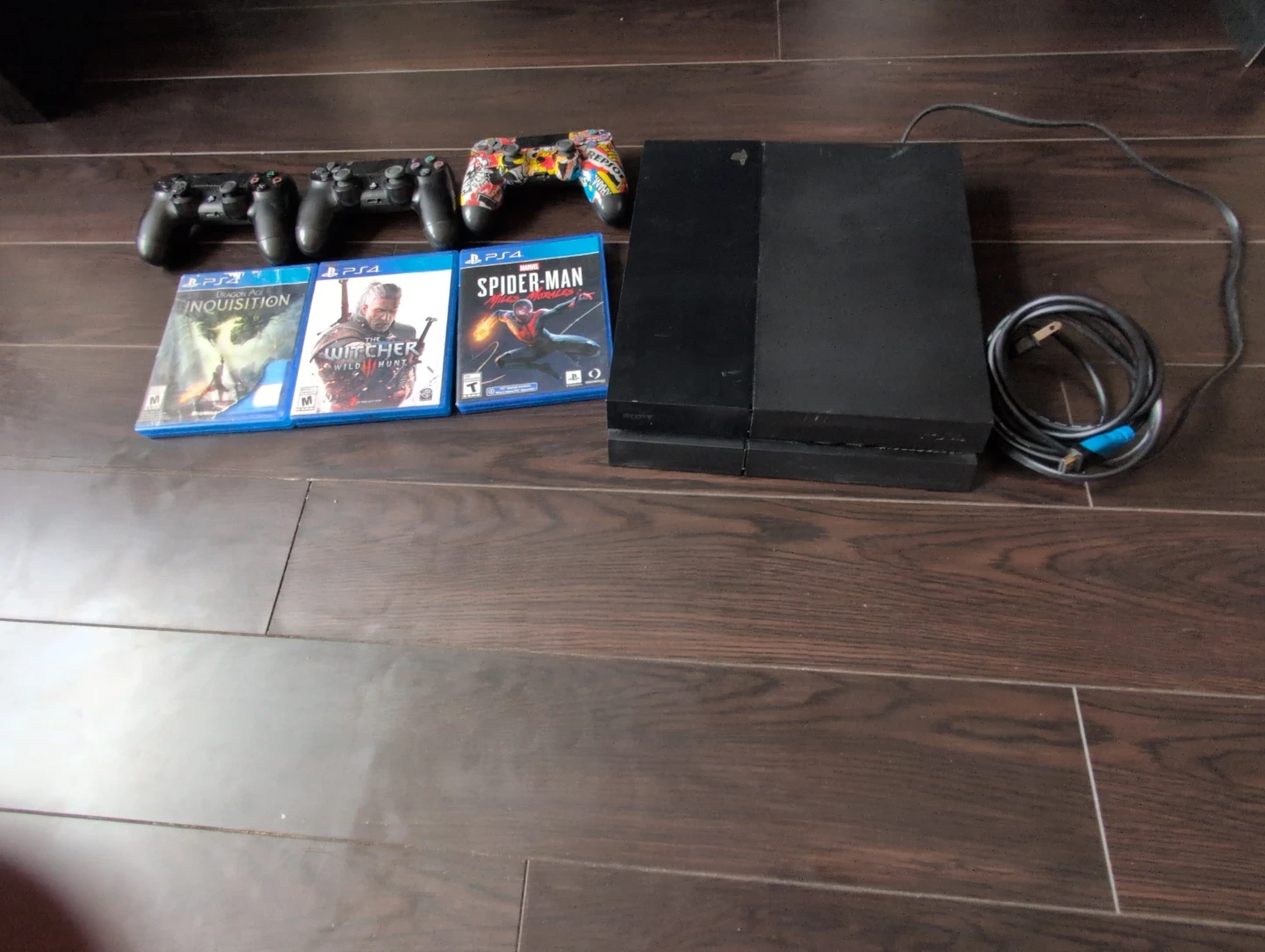 Selling a used PlayStation 4. Includes the console, power cable, and several games: Spider-Man, The Witcher 3, and Dragon Age Inquisition. Also comes with multiple controllers for multiplayer fun!