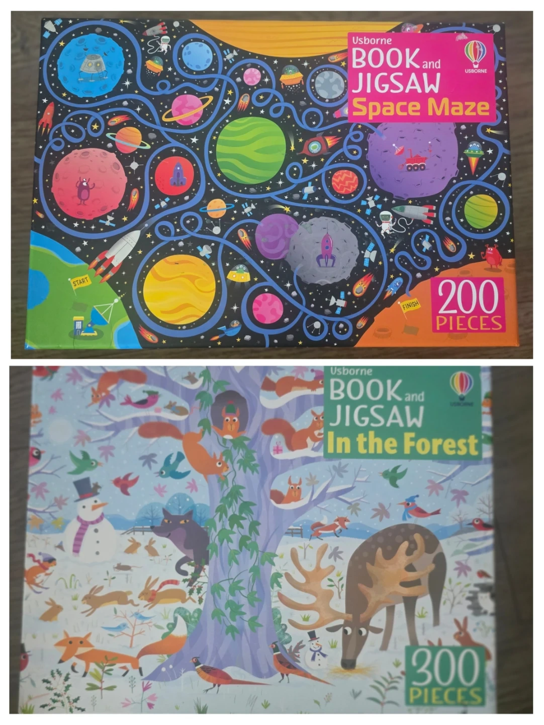 I'm selling a set of Usborne book and jigsaw puzzles! One is a 200-piece Space Maze puzzle, and the other is a 300-piece In the Forest puzzle. Great for kids who love to read and do puzzles