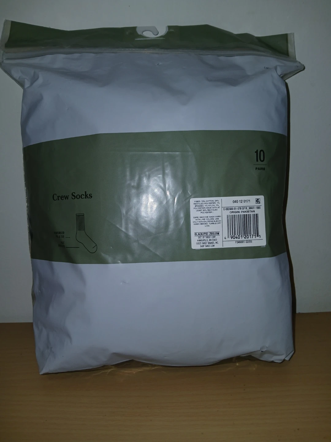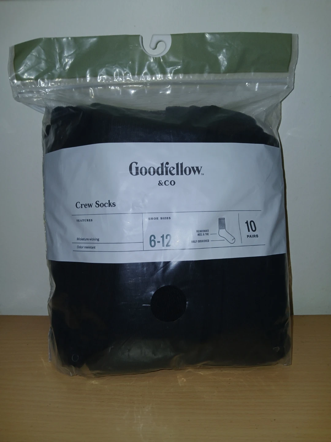 I'm selling a pack of Goodfellow & Co. crew socks. These are size 6-12 and come with 10 pairs. They are moisture-wicking and odor-resistant!