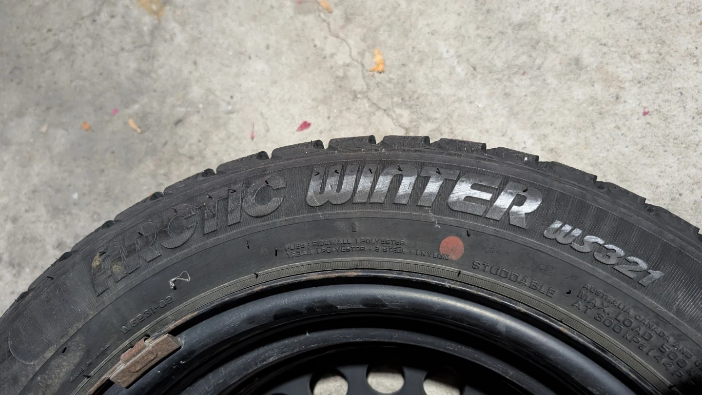 Selling a Weathermax Arctic Winter WS321 tire. The size is 185/60R15. It has M+S rating and is studdable. Good for winter driving! 84T.. steel rims.. at least 2 seasons left.. just rims are 50 bugs take tore for free..
