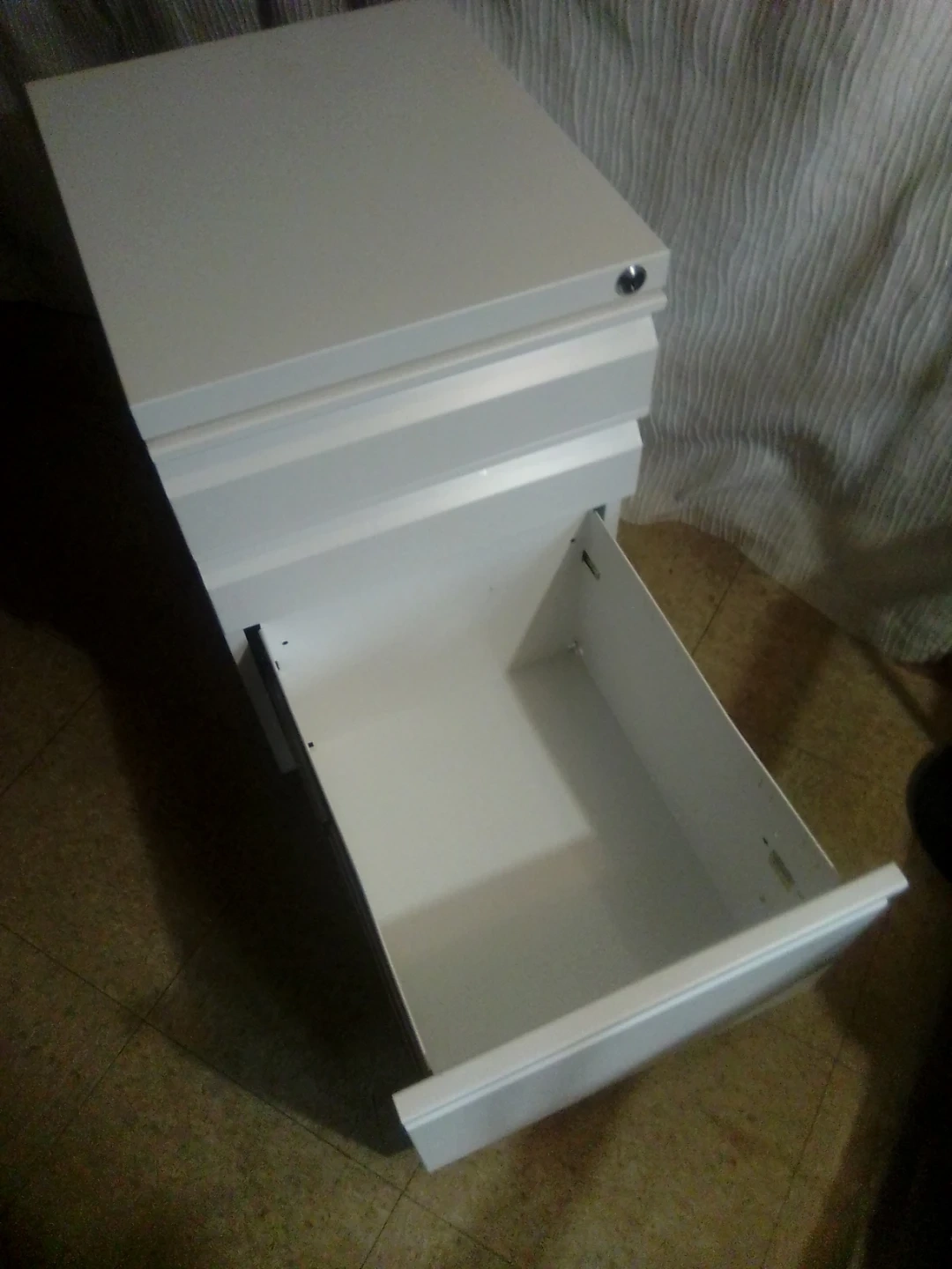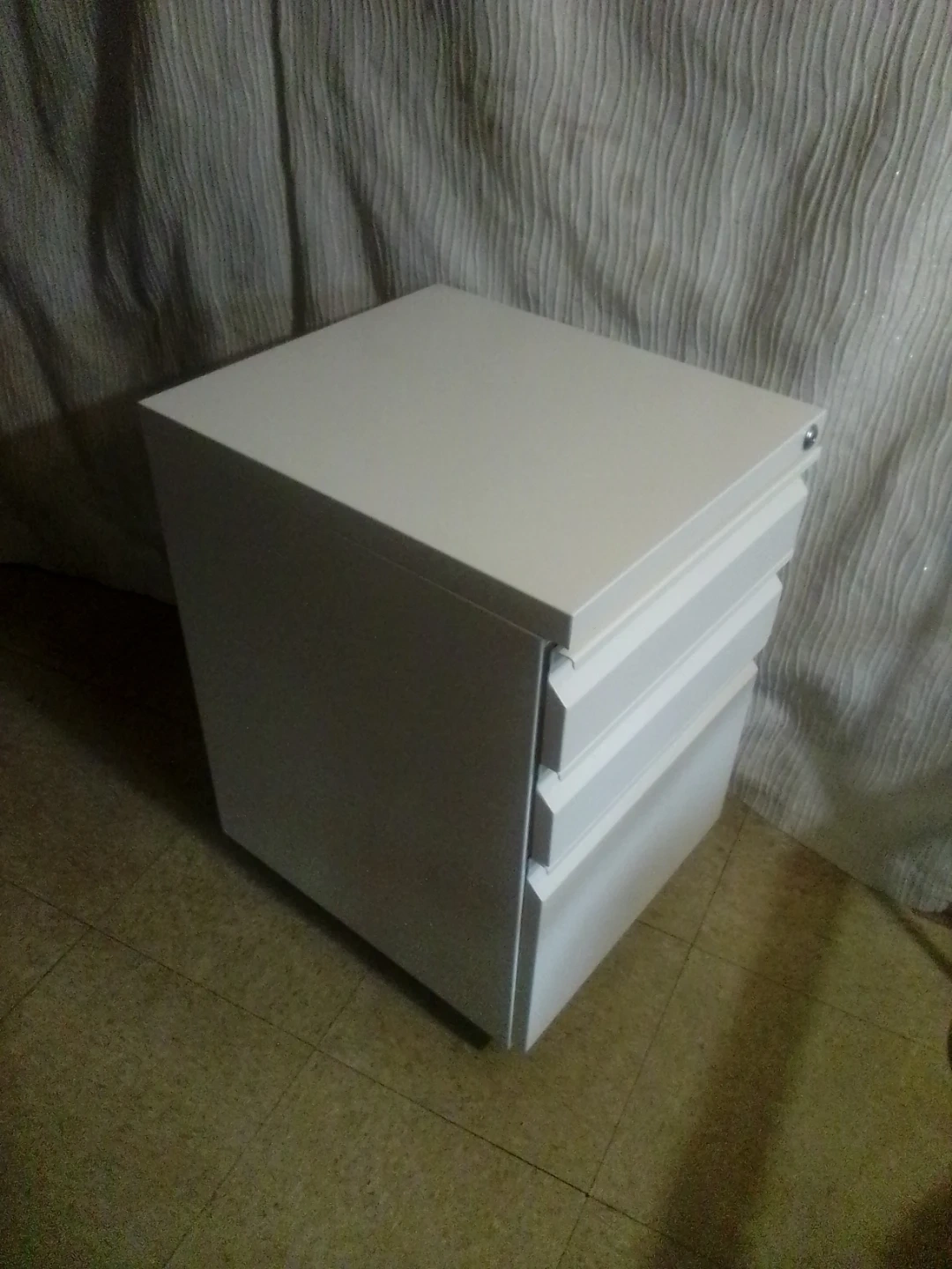 Here's a clean and simple white file cabinet with three drawers! It's perfect for organizing your documents and keeping your workspace tidy. It has a sleek design that fits well in any office or home setting. It's in great condition and ready to use!