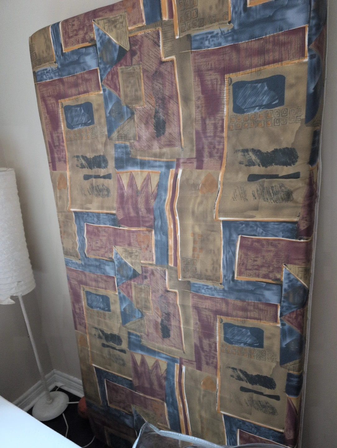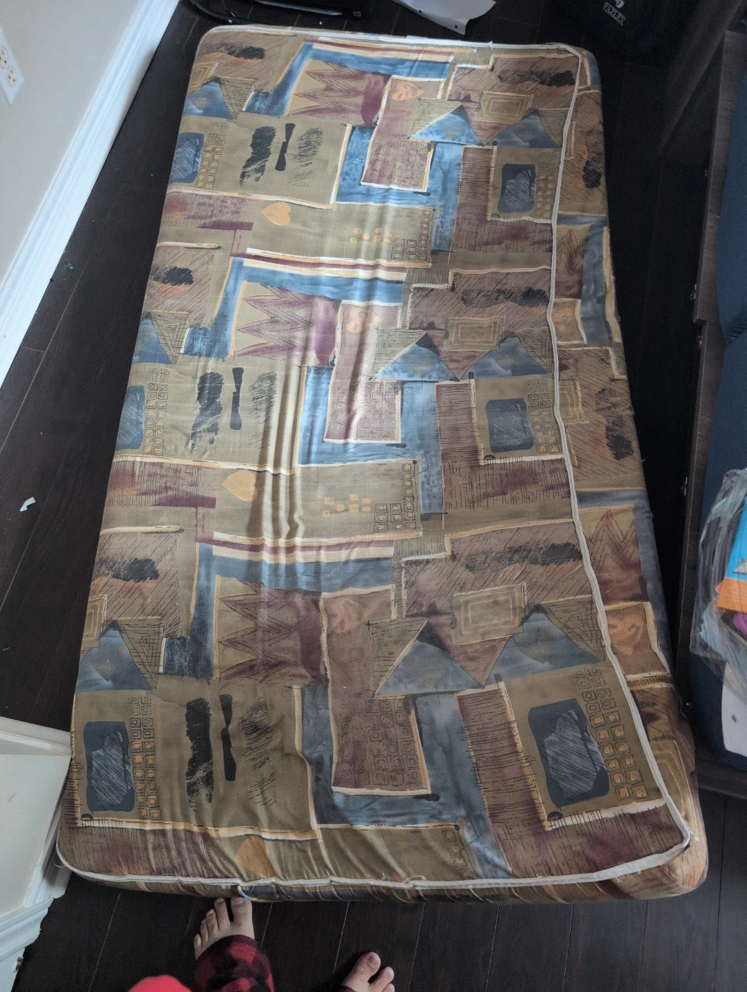 Selling a twin bed frame and mattress. The frame is a dark wood colour and comes disassembled. The mattress is used but in good condition. Foam mattress for kids weight only..