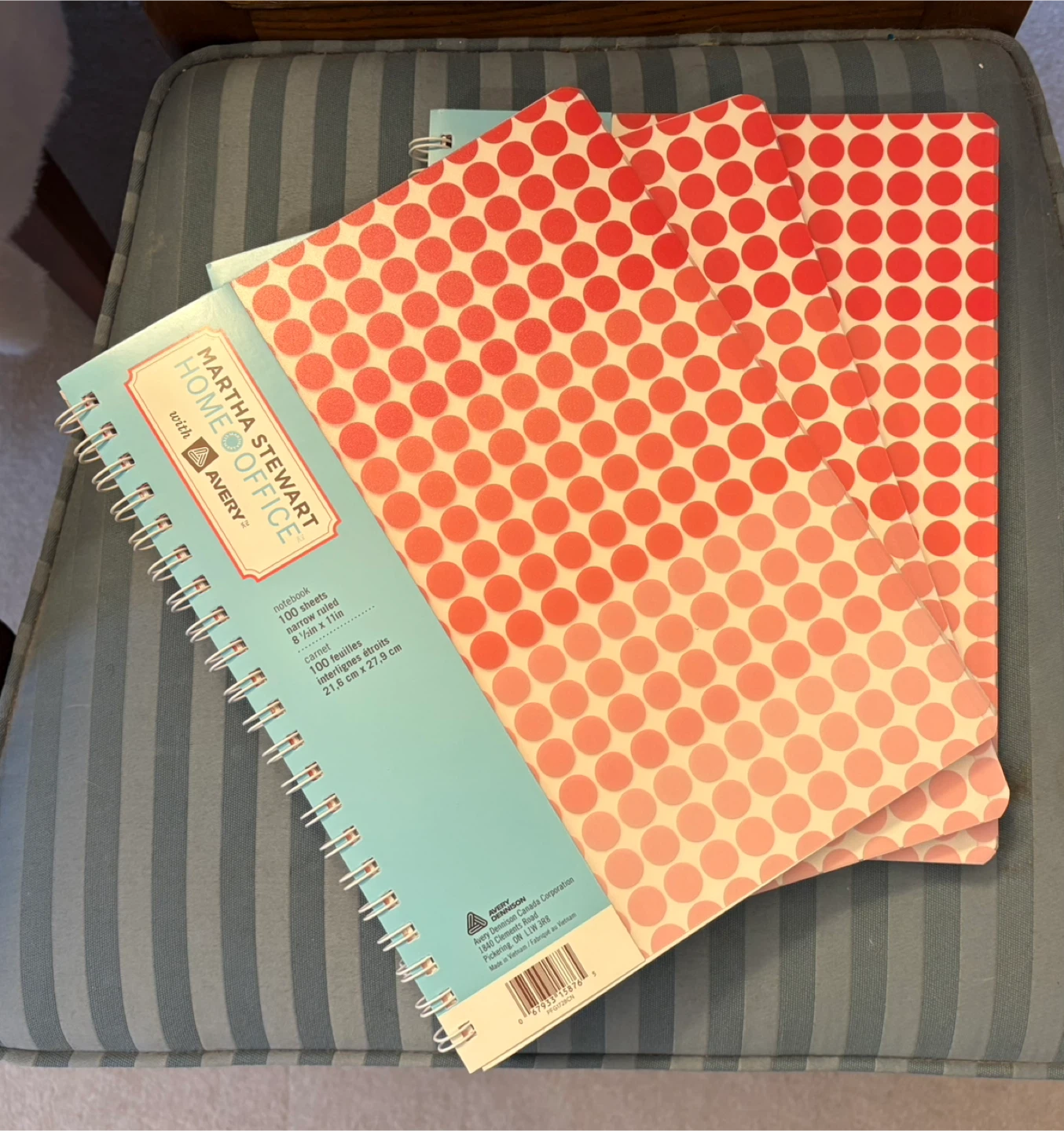 I'm selling a set of Martha Stewart Home Office notebooks! They have 100 sheets each and are 8 by 11 inches. Great for school, work, or just jotting down ideas. $5 each, 3 available 😊