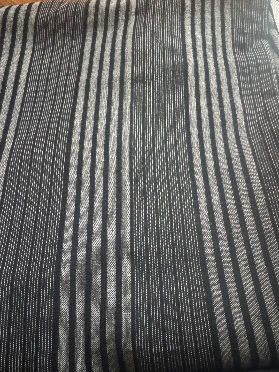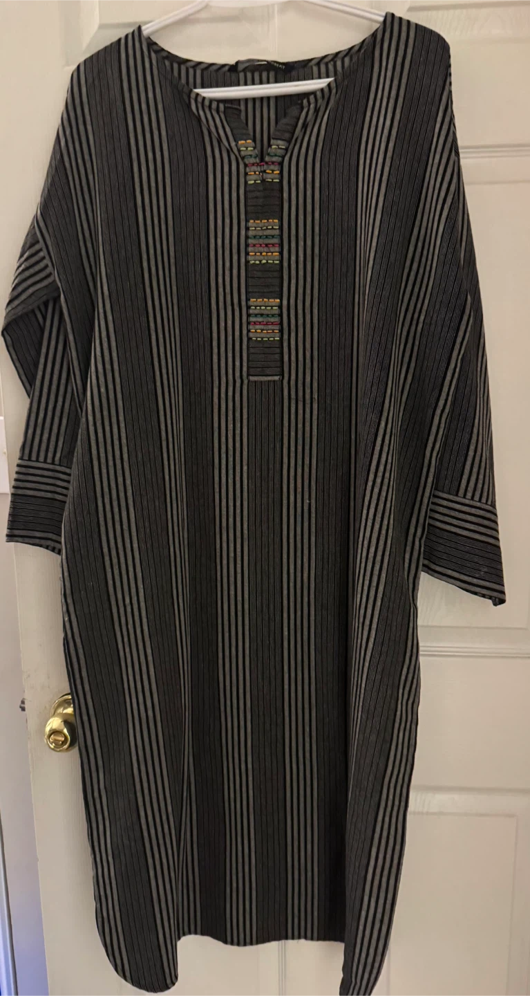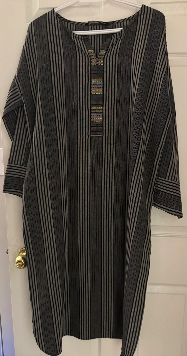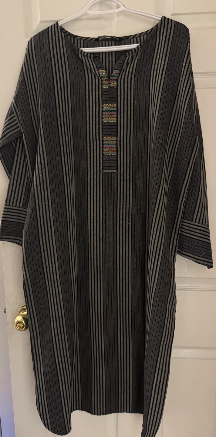 Here's a beautiful shirt with a striped pattern! It's a black and grey colour, and made of a soft cotton. Loose fit great for winter as well.
