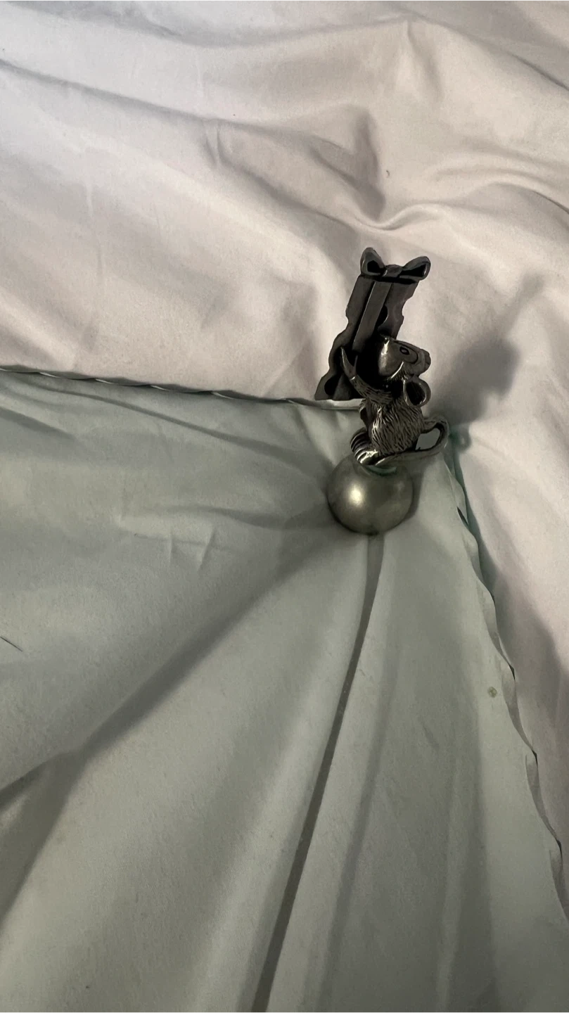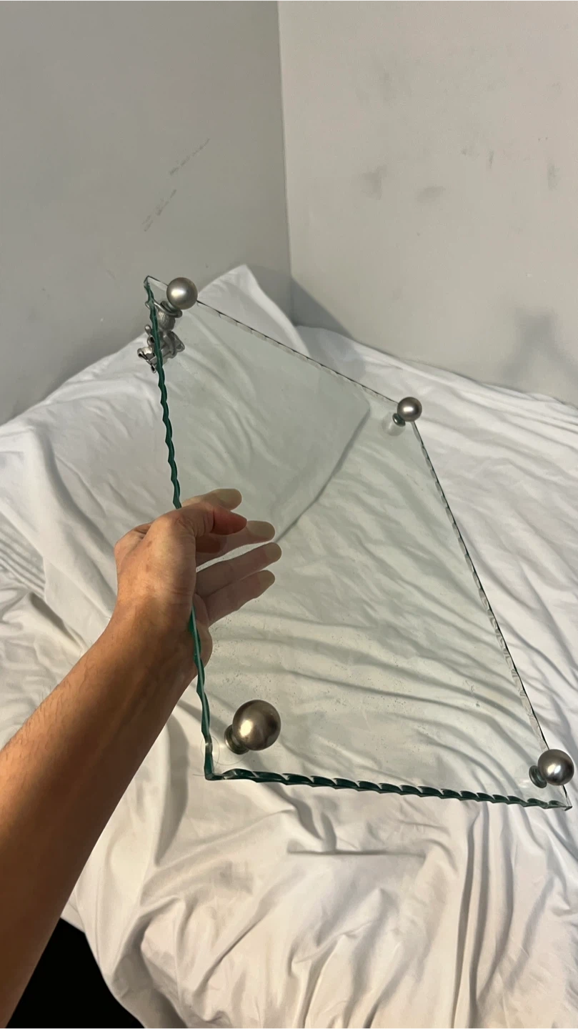 Selling a unique glass shelf! It has a decorative silver mouse figurine at one corner, adding a touch of whimsy to any room. The shelf is in good condition and ready to use