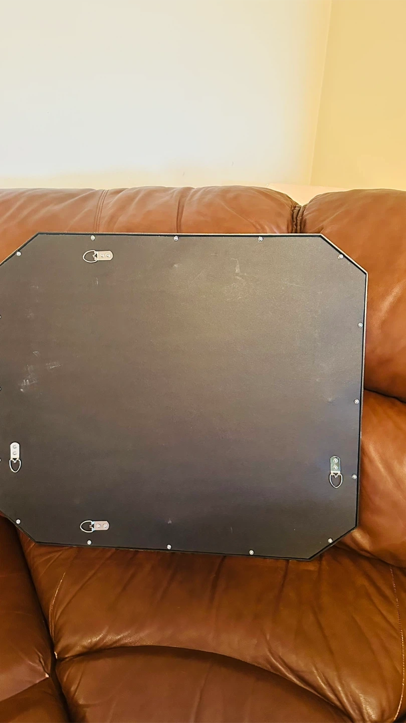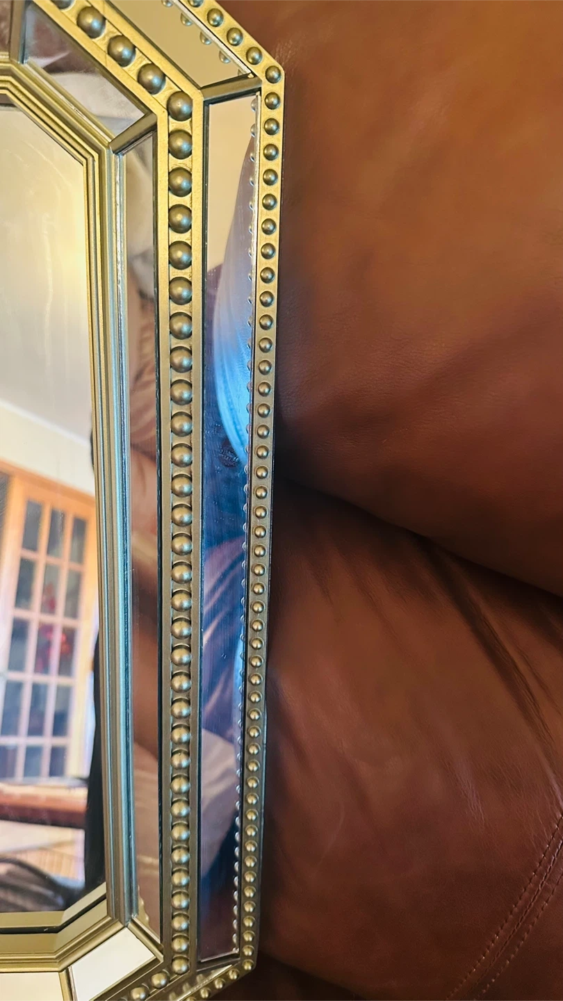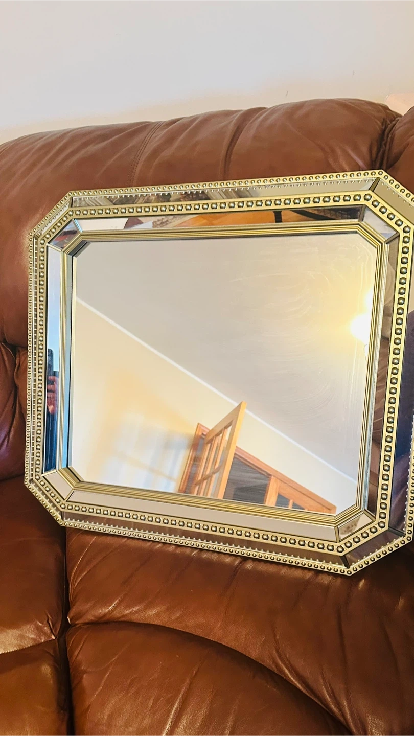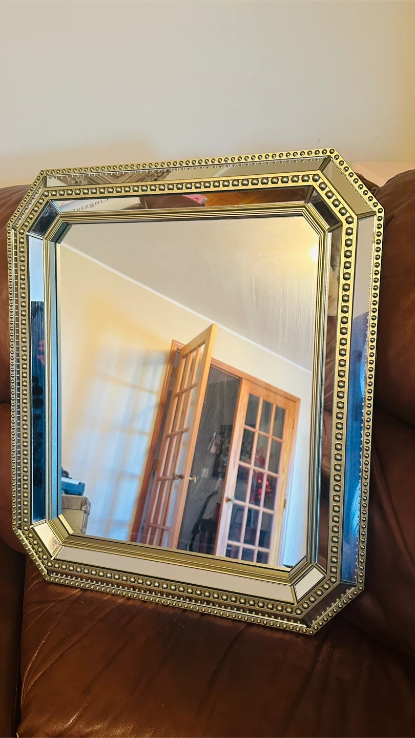Here's a decorative octagon-shaped mirror with a gold beaded frame. It's perfect for adding a touch of elegance to any room. The mirror is in great condition and ready to brighten up your space!