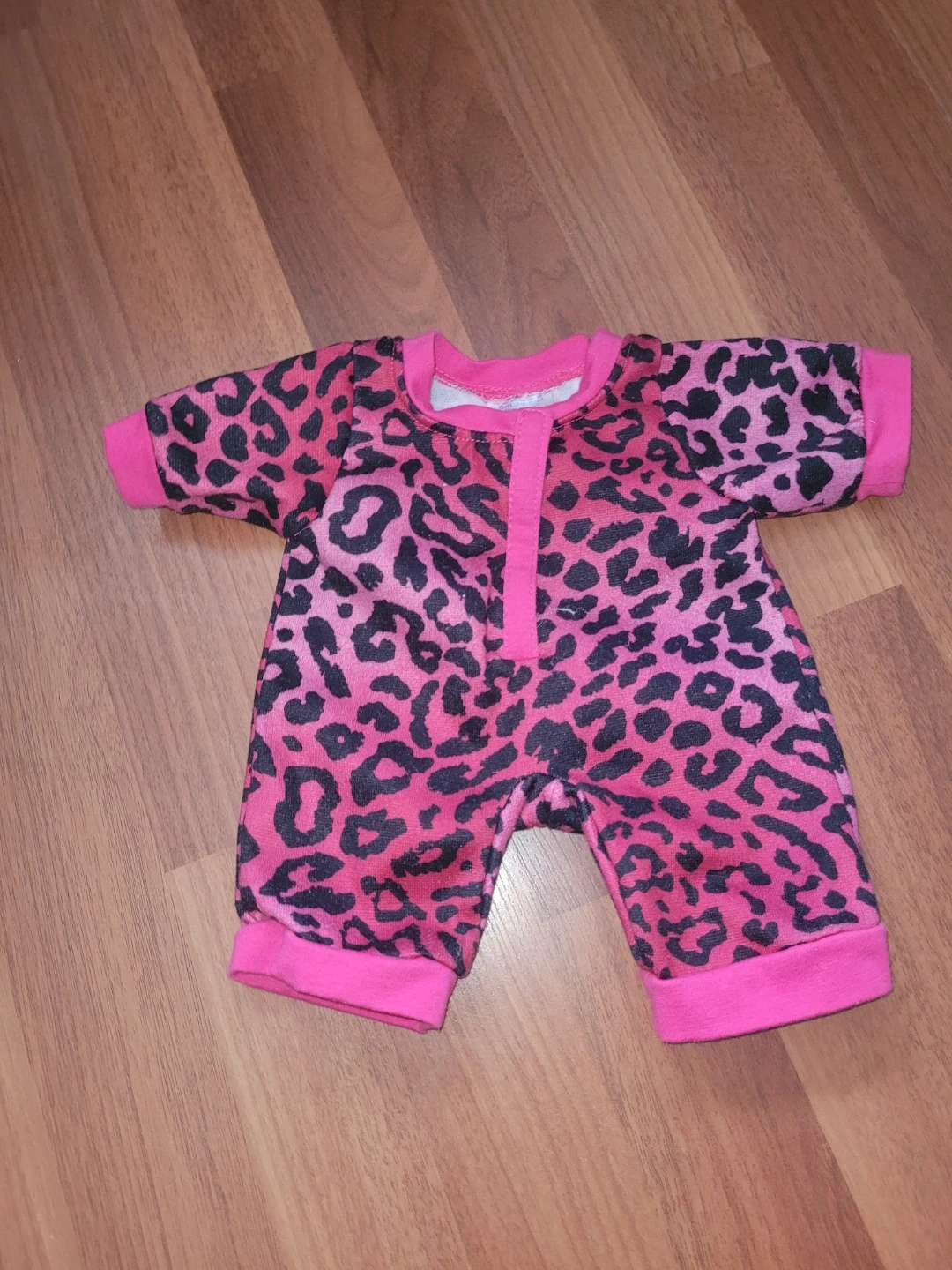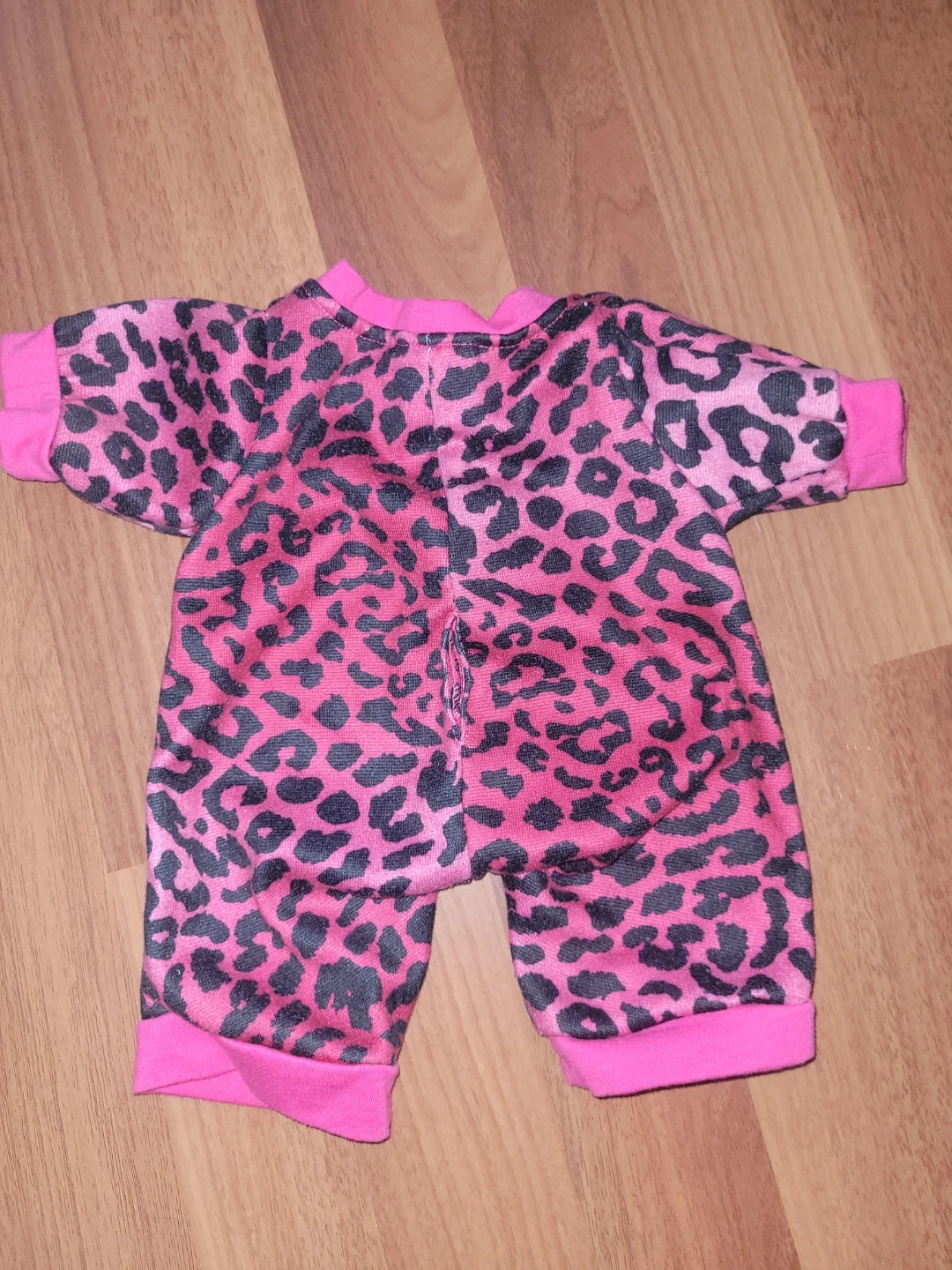 This adorable pink and black leopard print onesie is designed to fit build a bear friends or Cabbage Patch dolls, adding a touch of fun and style to playtime. This item is in used condition. It's looking for a new home to be loved.