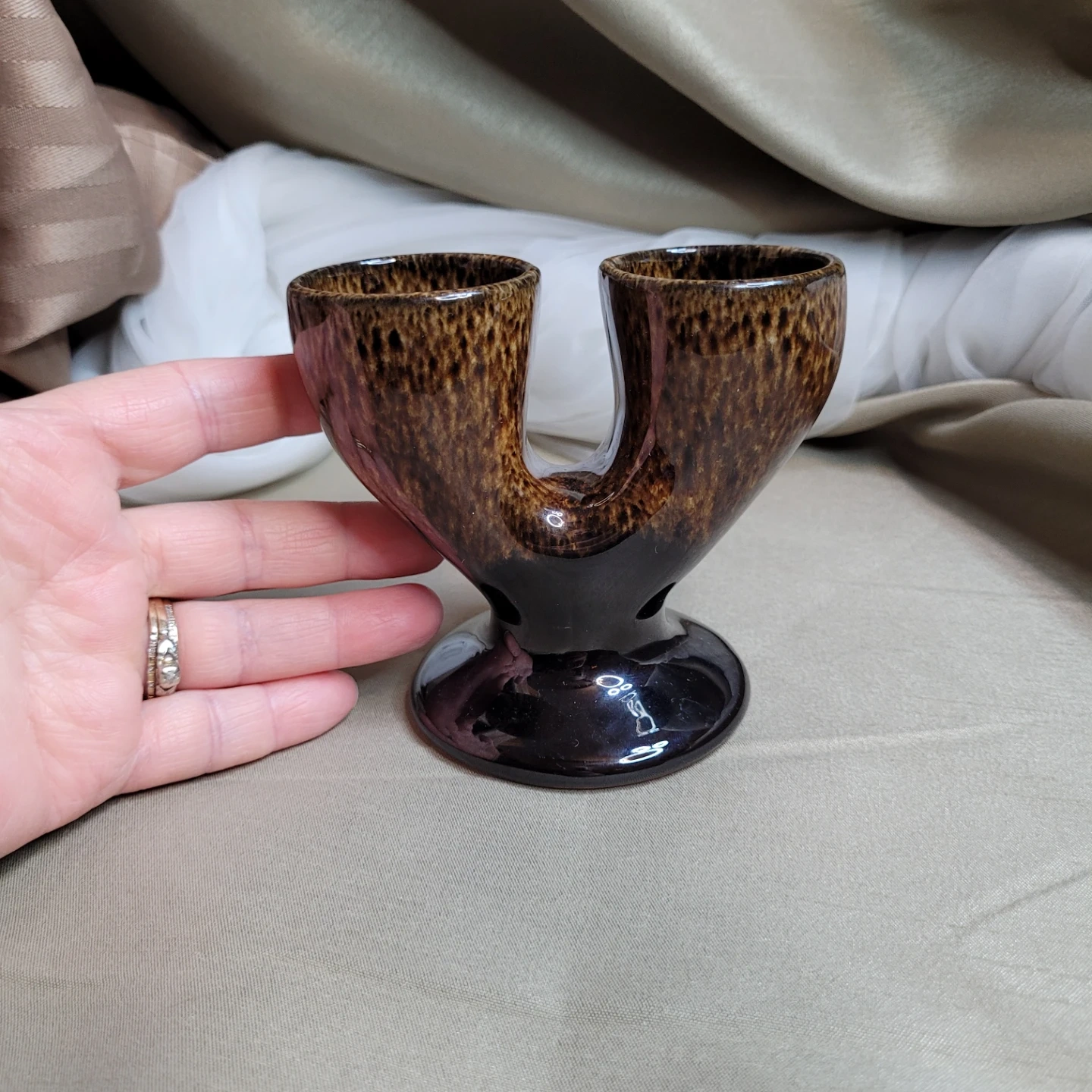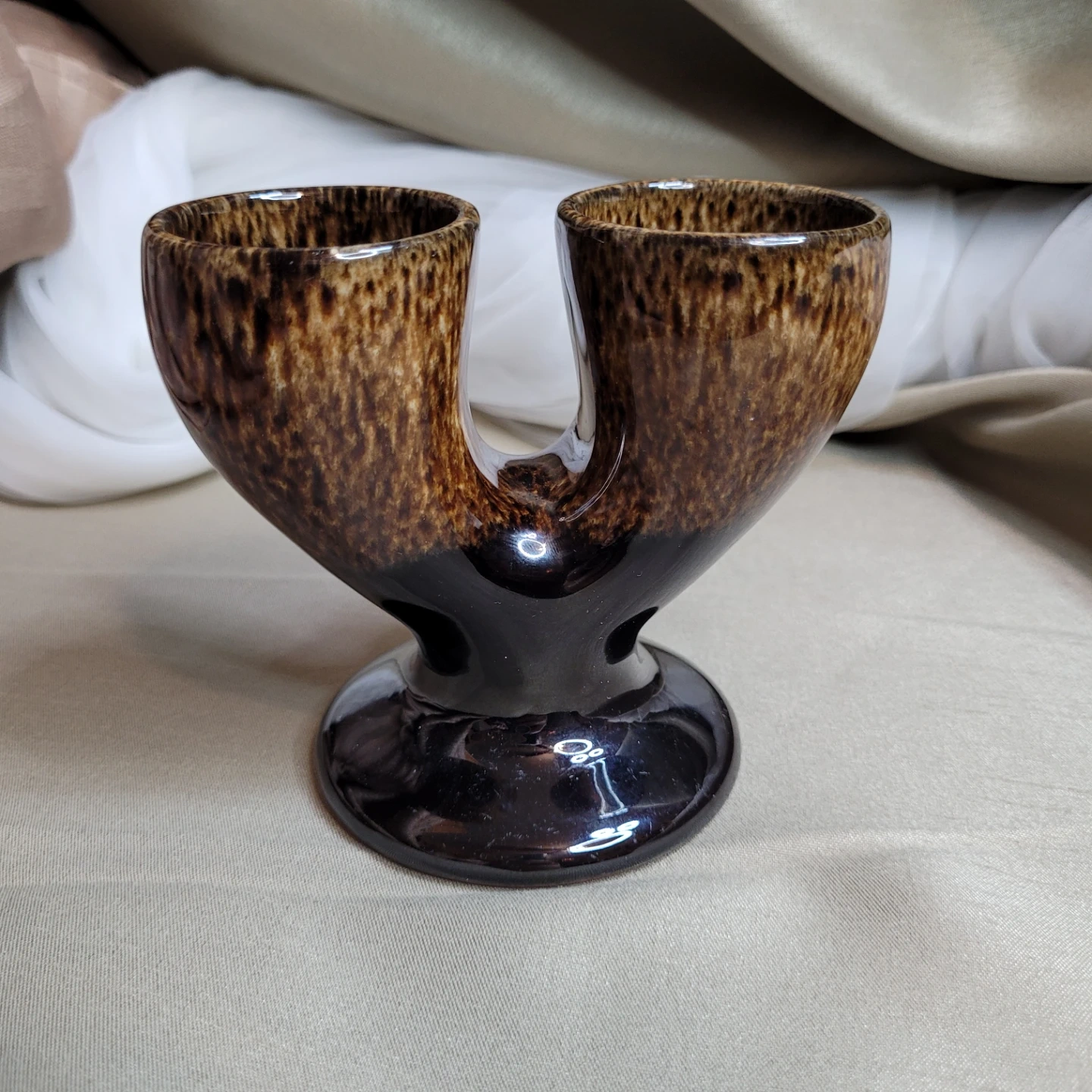 Vintage Glazed Pottery Double Egg Cup Holder