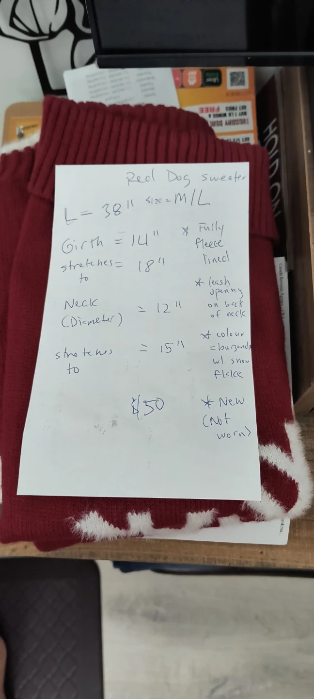 This Live Love Bark dog sweater is brand new and has never been worn! It's a size M/L with a burgundy colour and a cute snowflake design.