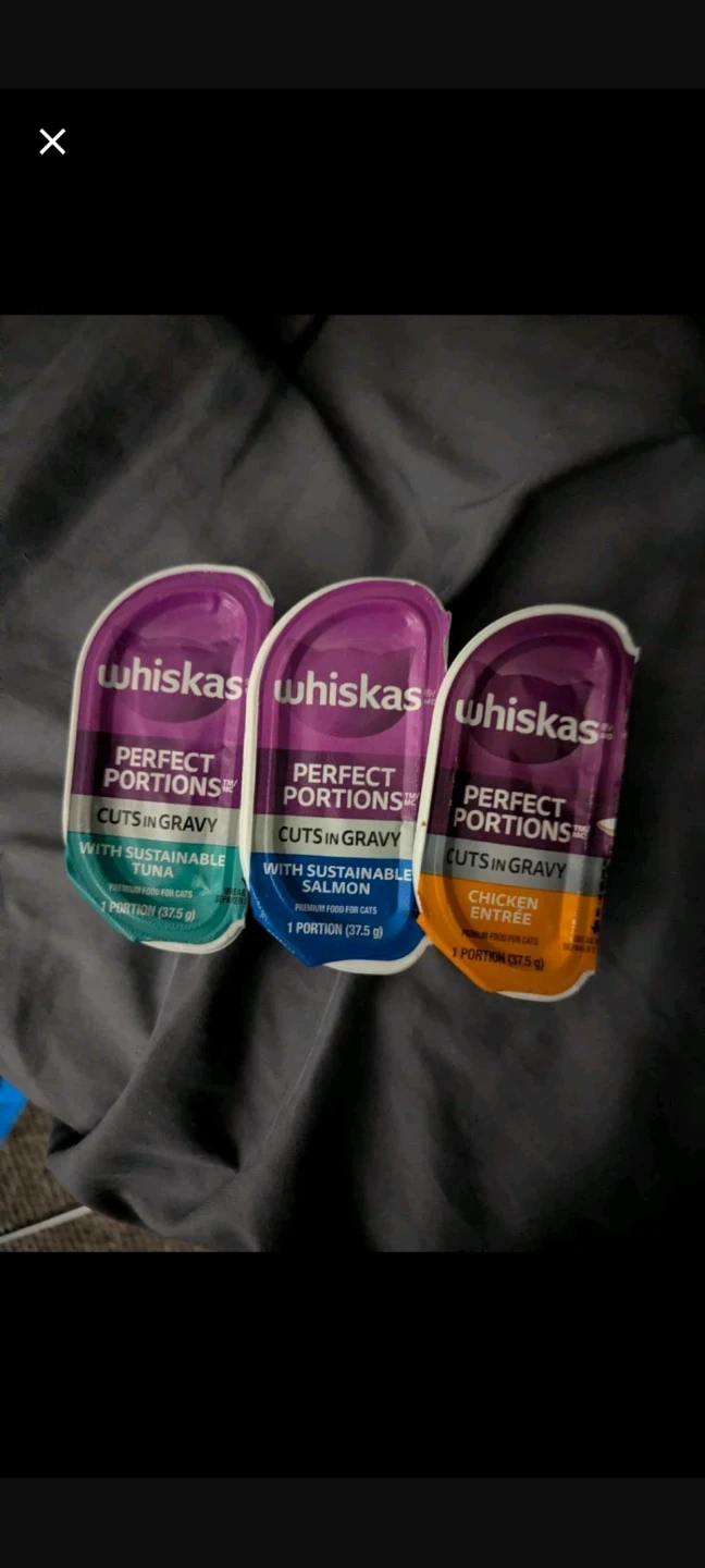 Selling three packs of Whiskas Perfect Portions cat food! There's tuna, salmon, and chicken entree. Each portion is 37.5g.