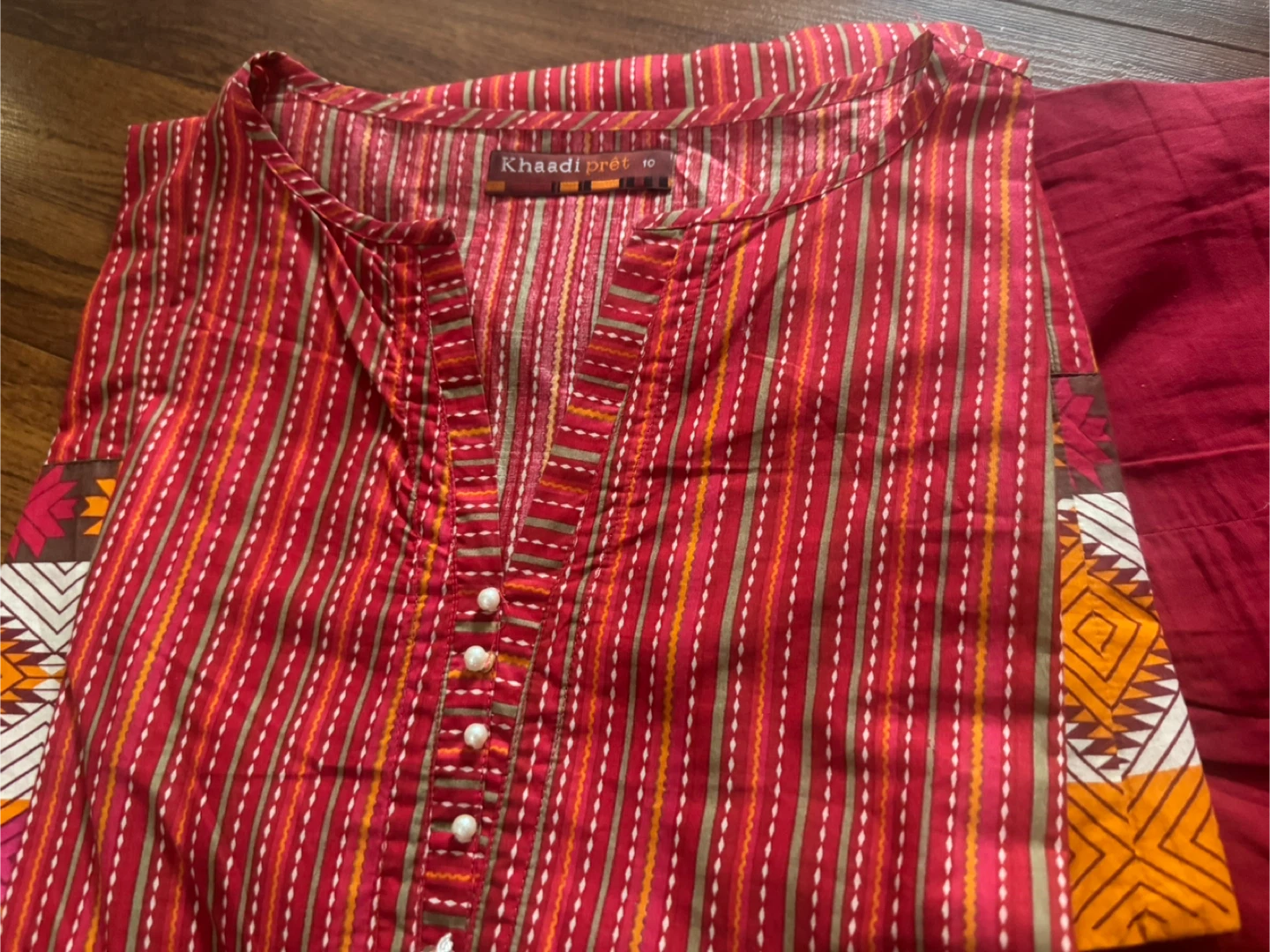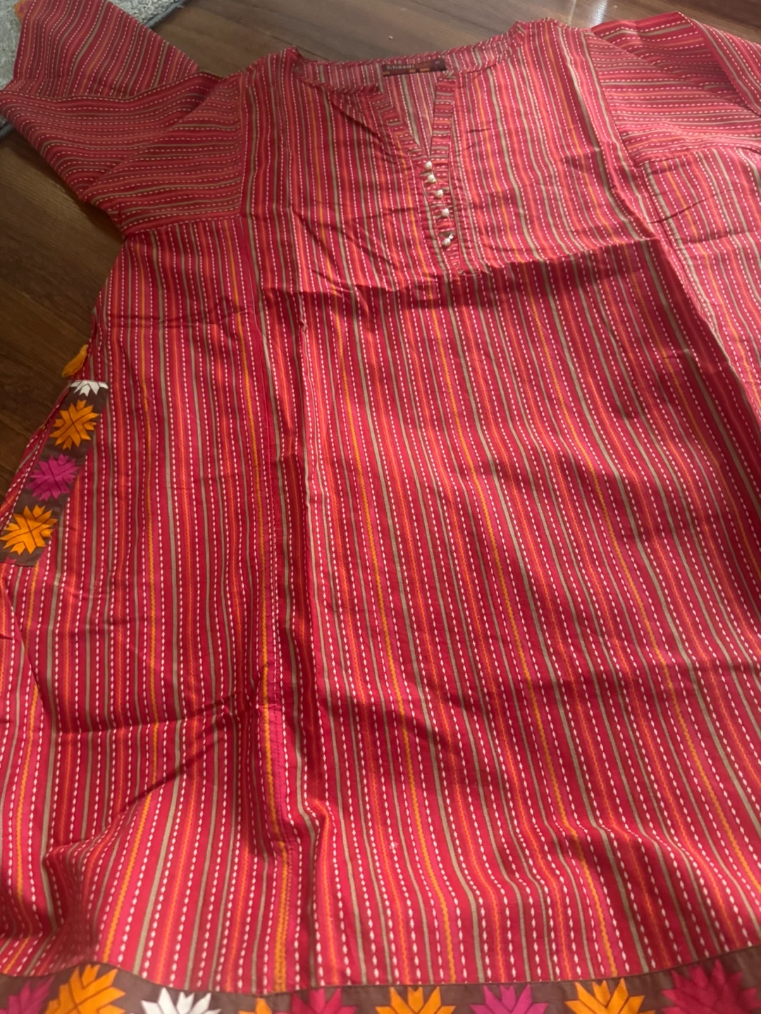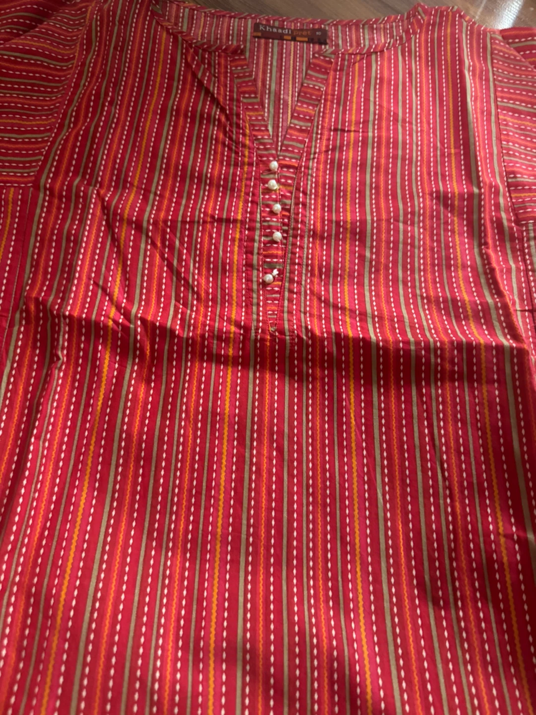 Selling a beautiful Khaadi Pret kurti in size 10. It features a vibrant red striped pattern with lovely detailing. Perfect for adding a pop of colour to your wardrobe!