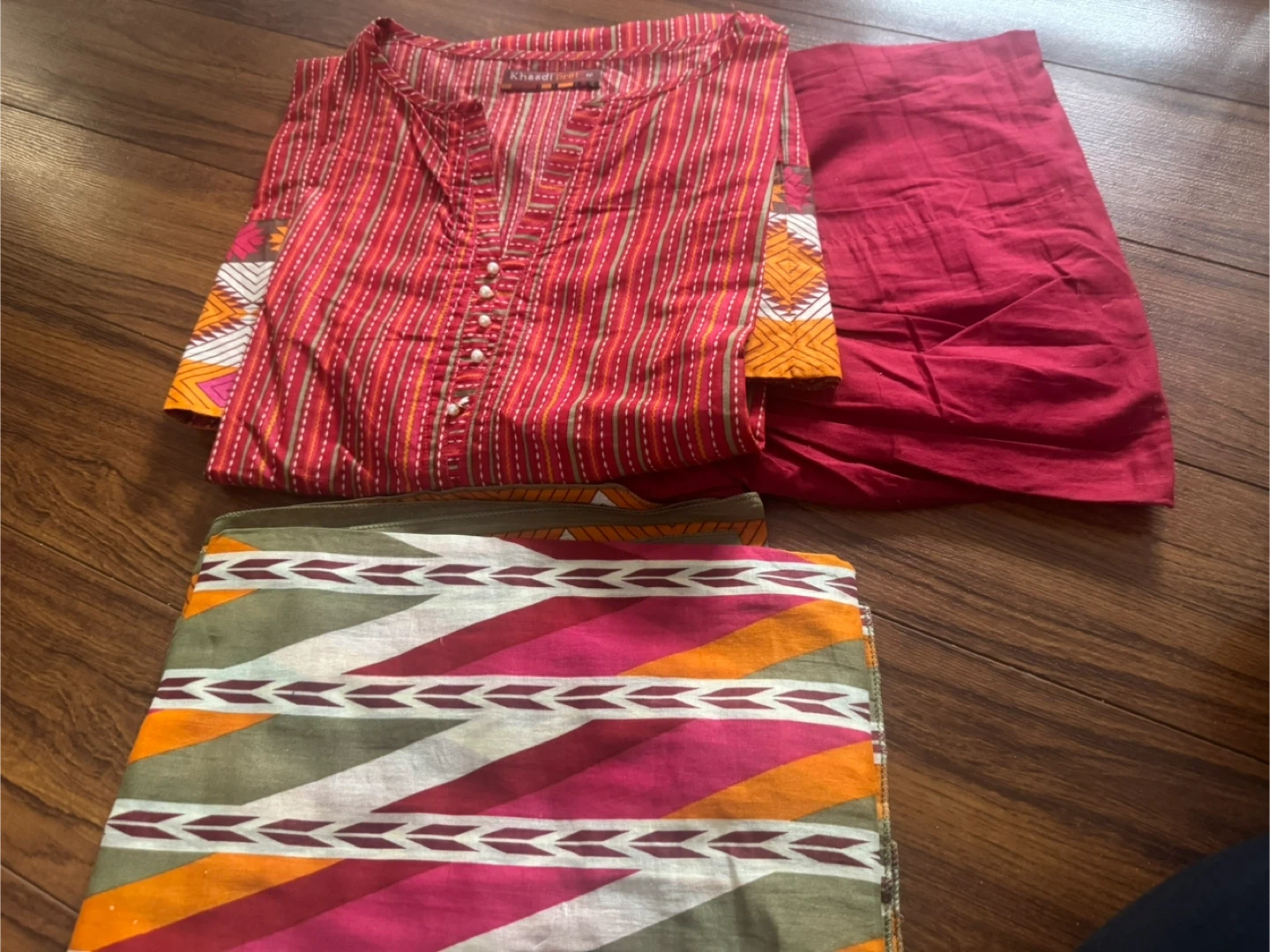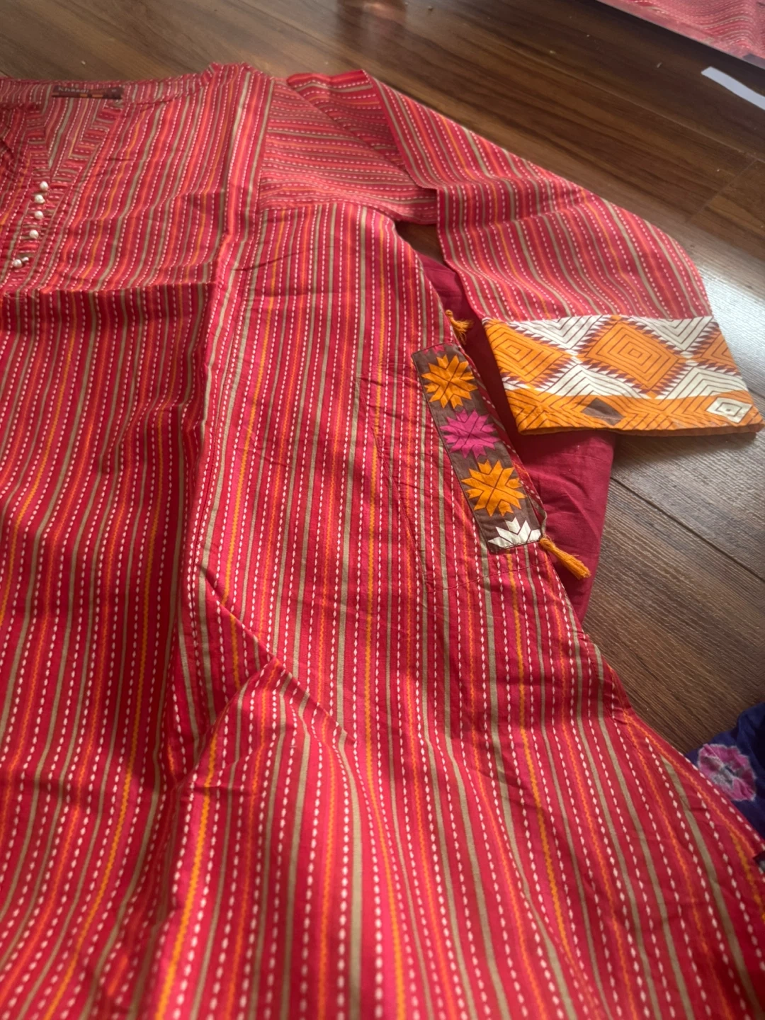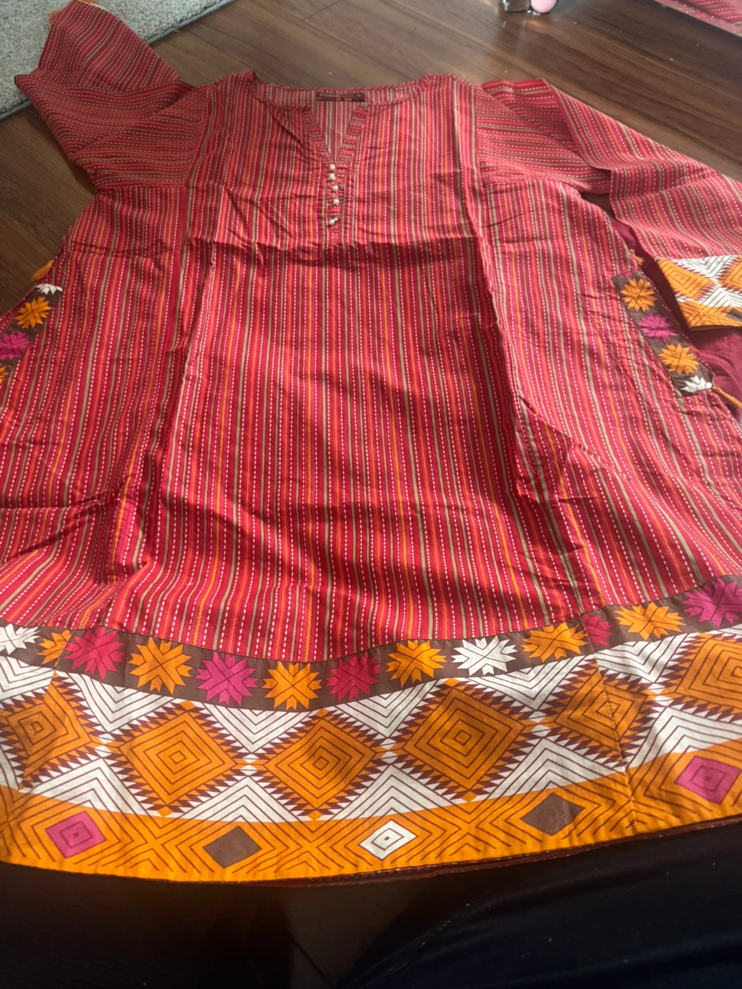 Selling a beautiful Khaadi Pret kurti in size 10. It features a vibrant red striped pattern with lovely detailing. Perfect for adding a pop of colour to your wardrobe!