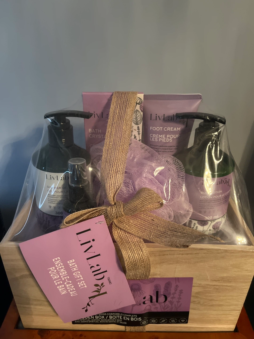 Selling a LivLab bath gift set, complete with shower gel, bath crystals, foot cream, and body lotion! It also includes a loofah for a complete spa experience at home. The set comes beautifully packaged in a wooden box, making it a perfect gift for yourself or someone special