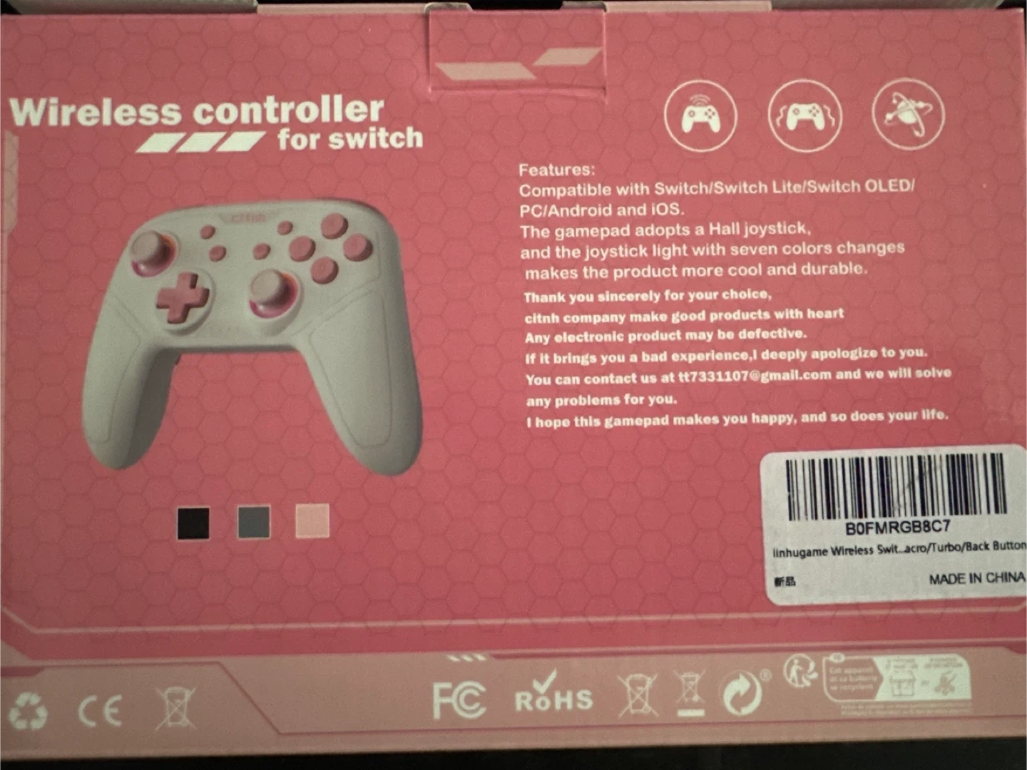 Selling a brand new ctnh wireless controller for Nintendo Switch! It's compatible with Switch/Switch Lite/Switch OLED/PC/Android and iOS. The gamepad adopts a Hall joystick, and the joystick light with seven colors changes. It's made to be more cool and durable. Unleash your gaming style with this fun pink controller! Box included