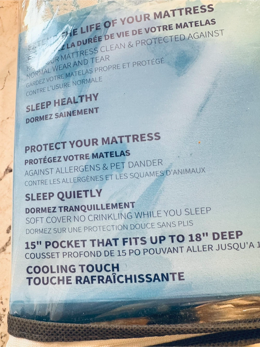 New in the package Keep your mattress clean and protected against normal wear and tear with this Ariza Sleep Premium Cooling Mattress Protector! It's designed to protect against allergens and pet dander, so you can sleep quietly on a soft cover that doesn't crinkle. This full-size protector has a 15" pocket that fits up to 18" deep and provides a cooling touch for a comfortable night's sleep