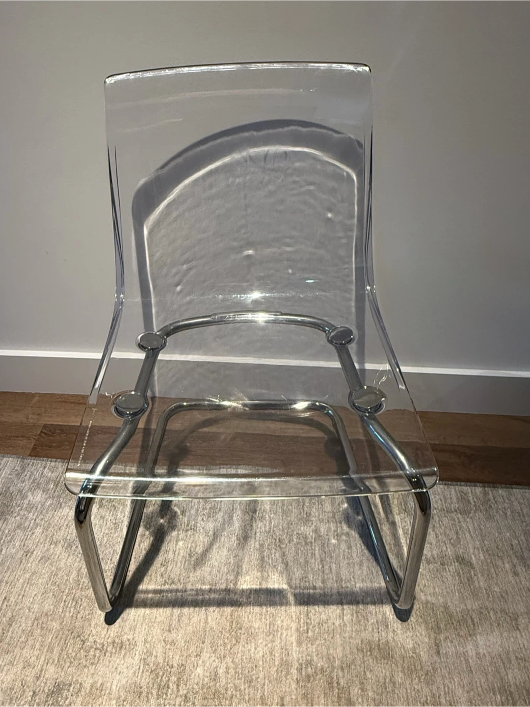 Selling a set of clear IKEA - TOBIAS dining chairs! These chairs feature a clear seat and a sleek chrome frame. Minor wear and tear, but great condition!