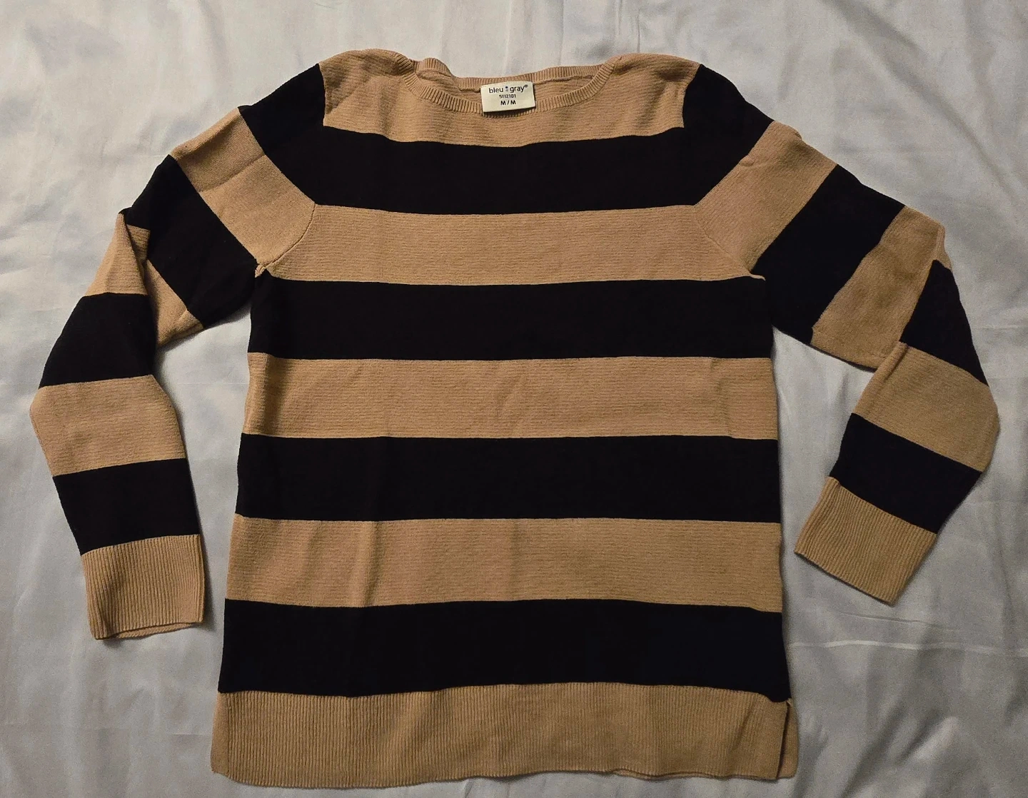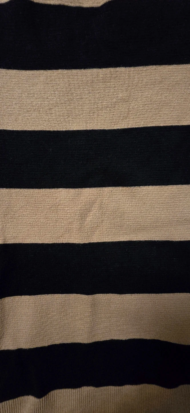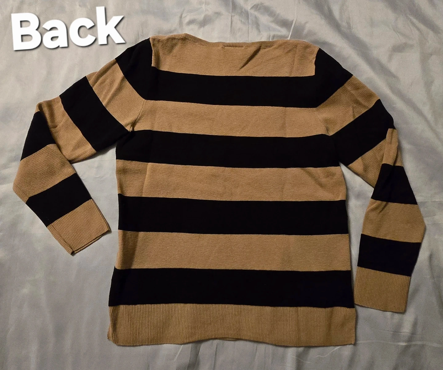 Comfy striped sweater! It's a size medium with a classic striped design in tan and black. Perfect for layering or wearing on its own!