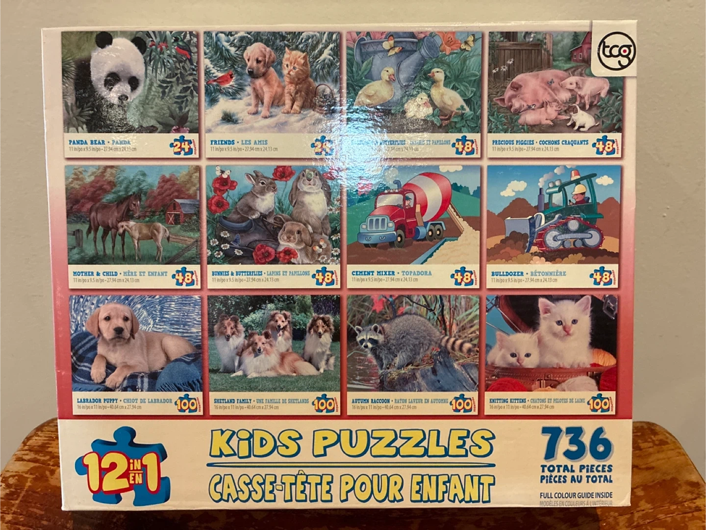 I'm selling a TCG Kids Puzzles 12 in 1 with 736 total pieces! It contains full colour guide inside. The puzzle features 12 different images including: Panda Bear, Friends, Precious Piggies, Mother & Child, Bunnies & Butterflies, Cement Mixer, Bulldozer, Labrador Puppy, Shetland Family, Autumn Raccoon, and Knitting Kittens