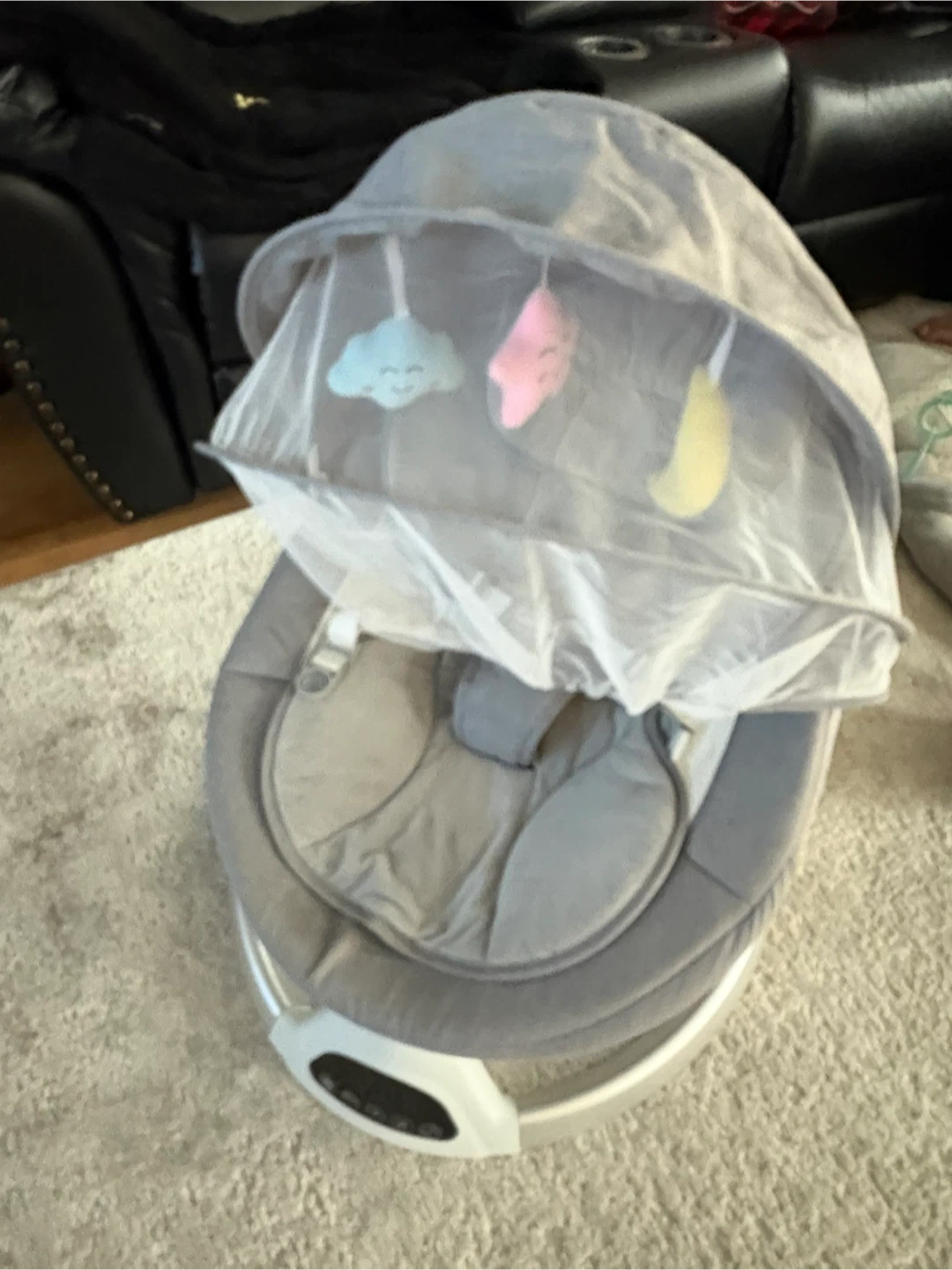 Selling electronics baby swing with a remote control in great condition! It's grey and features hanging toys for your little one to enjoy. This swing is perfect for soothing and entertaining your baby, giving you a bit of a break during the day
