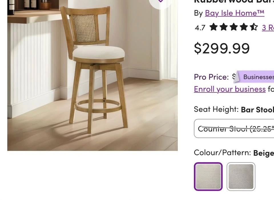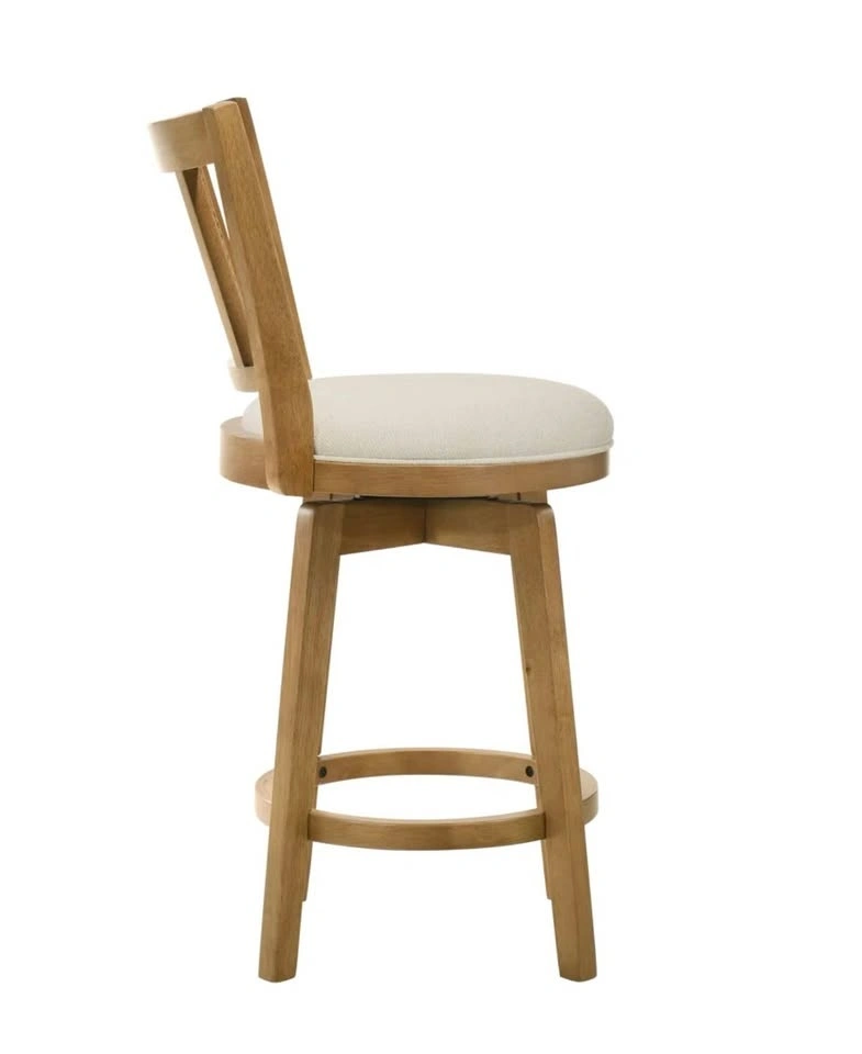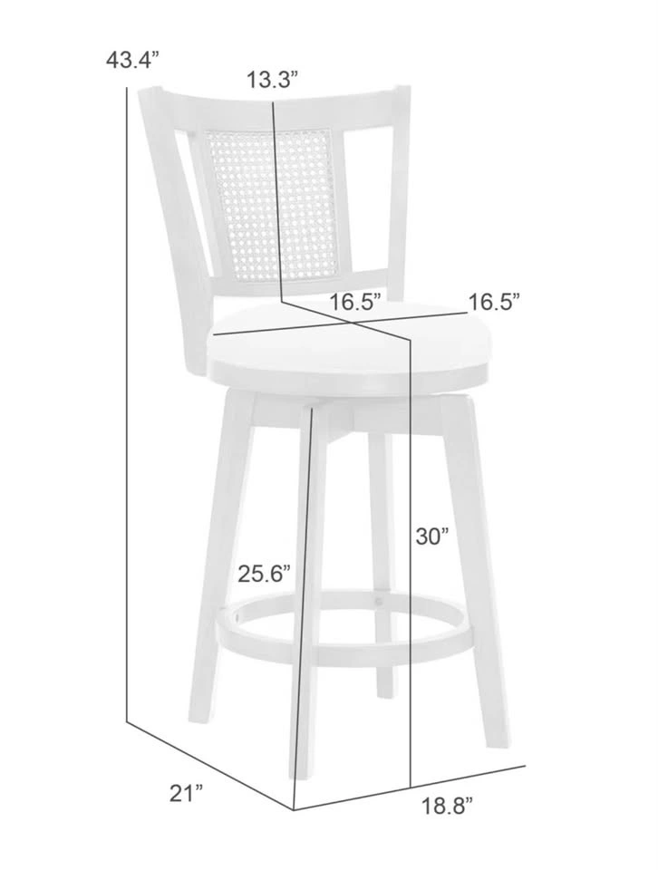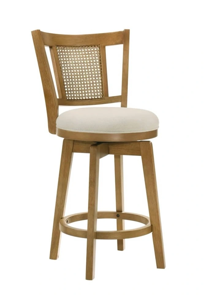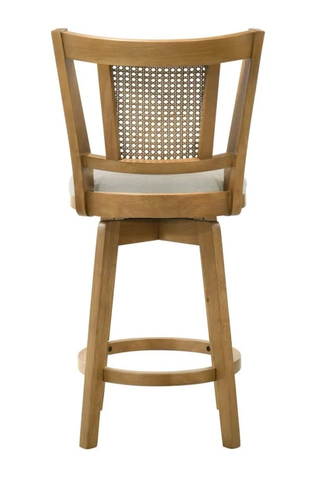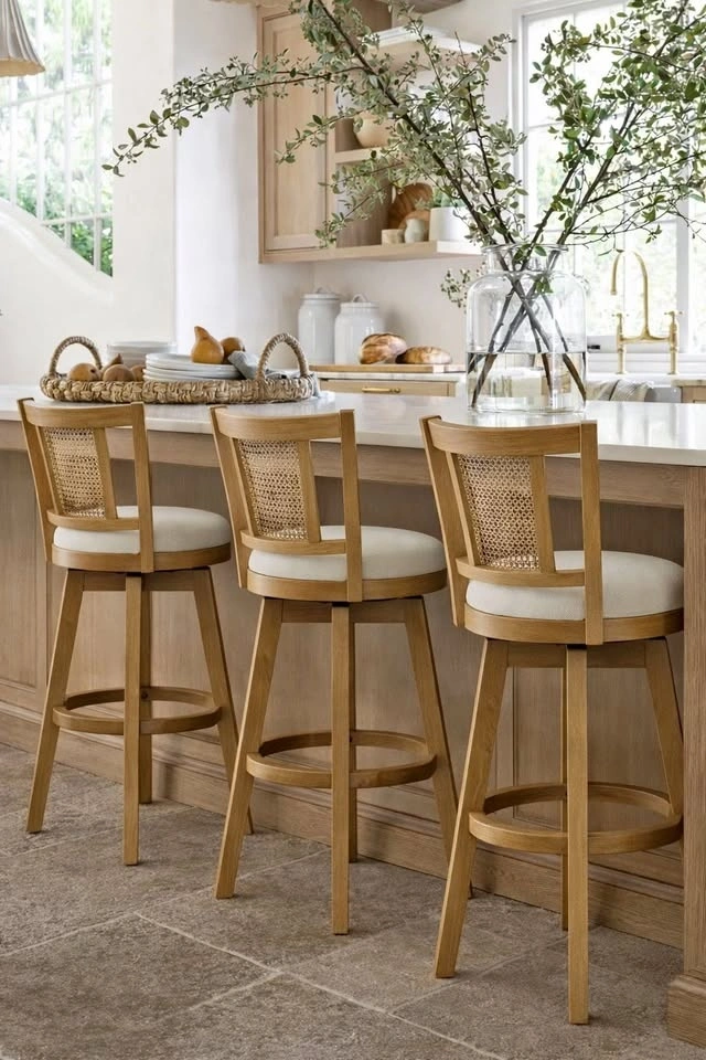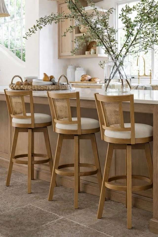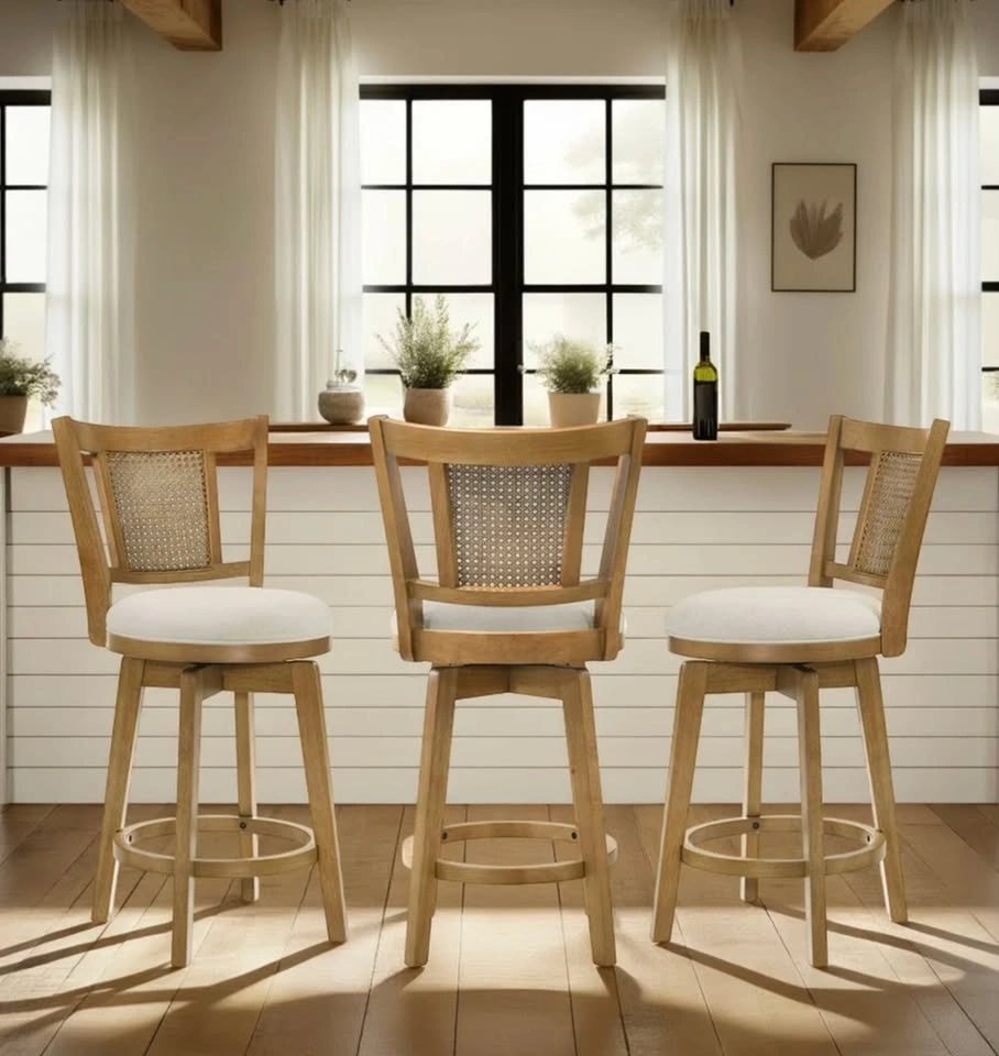 Beautiful farmhouse solid wood swivel stool set featuring a plush seat, rattan accents, and a smooth 360-degree swivel and a footrest for comfort.
