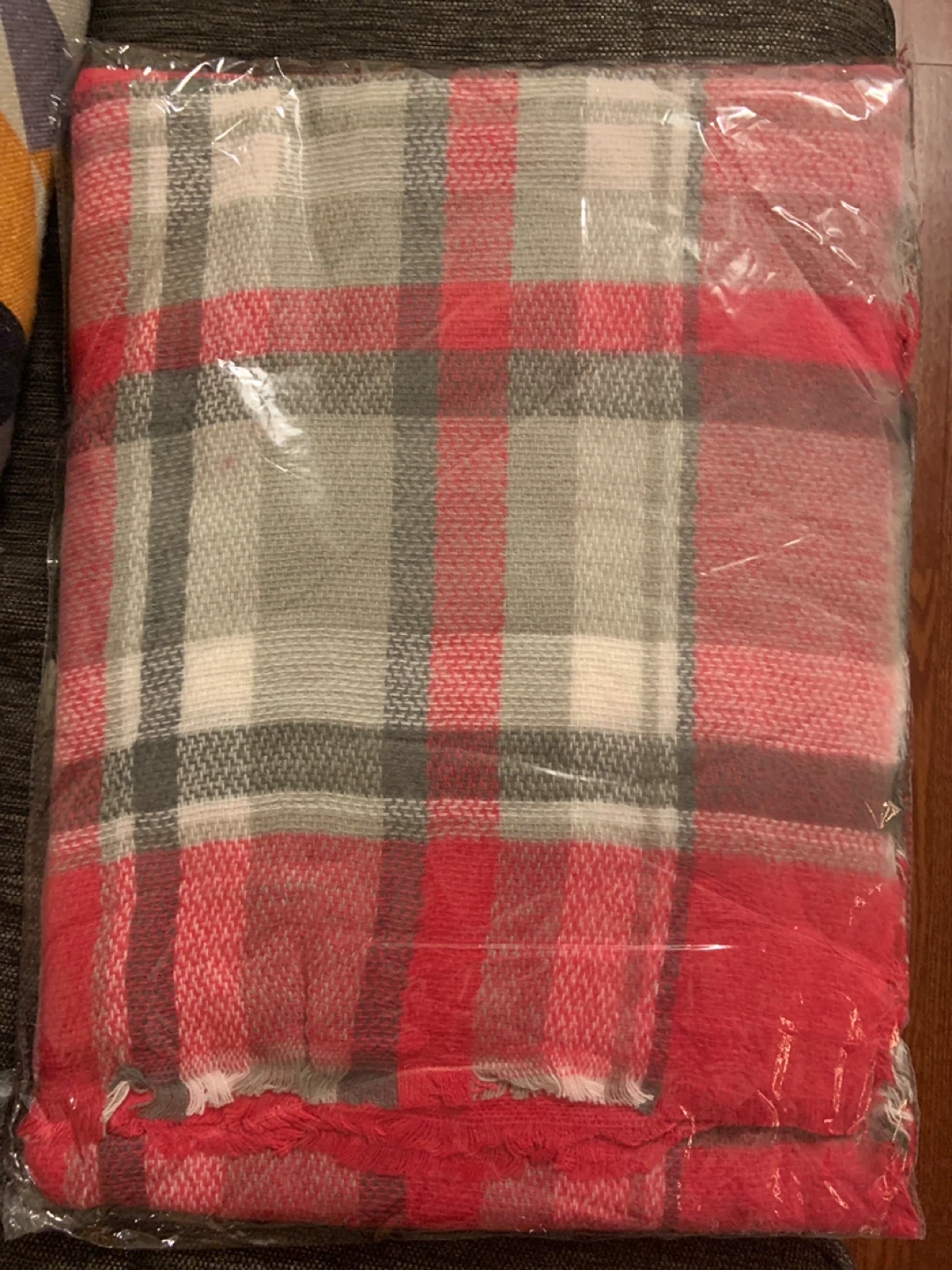- Stay cozy with this stylish pink plaid blanket scarf!