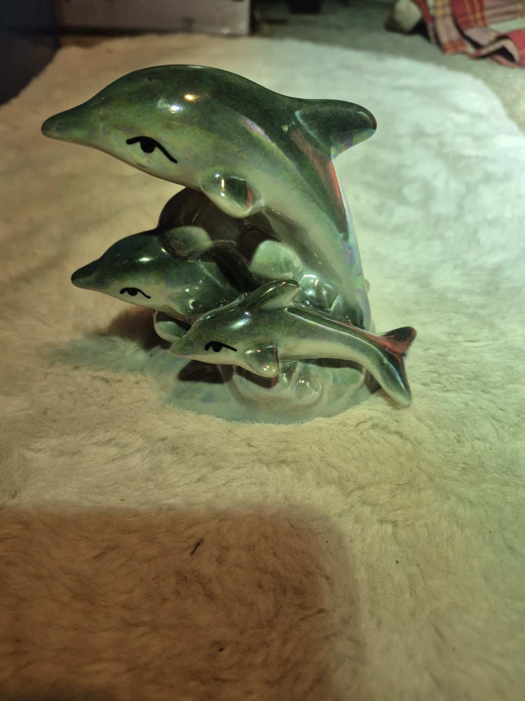 A charming vintage dolphin figurine! This ceramic piece features three dolphins in a stacked design, with a lovely iridescent finish. Perfect for adding a touch of ocean-themed decor to your home