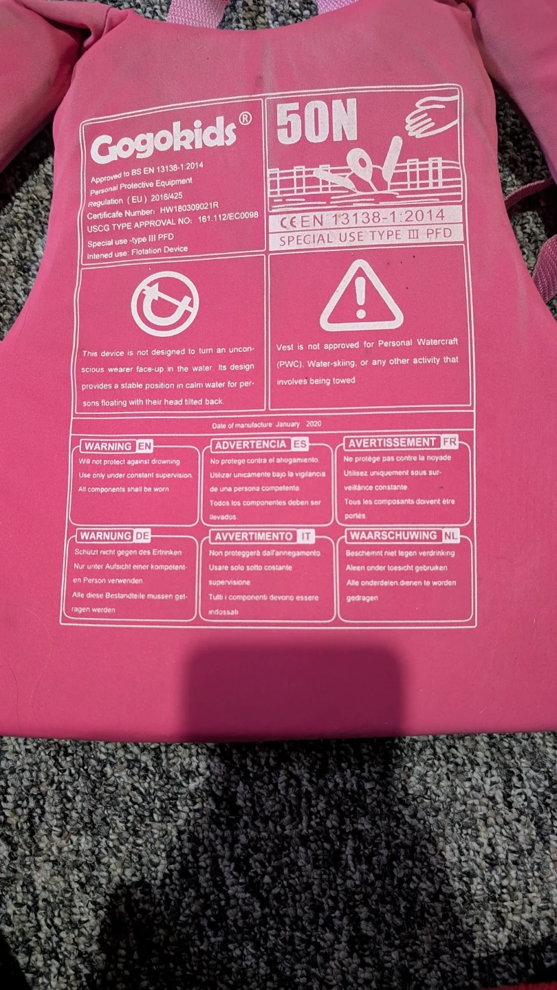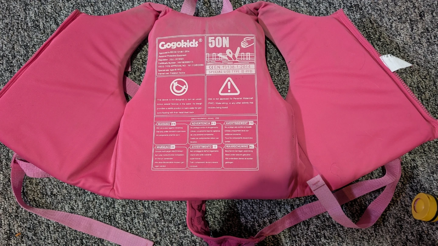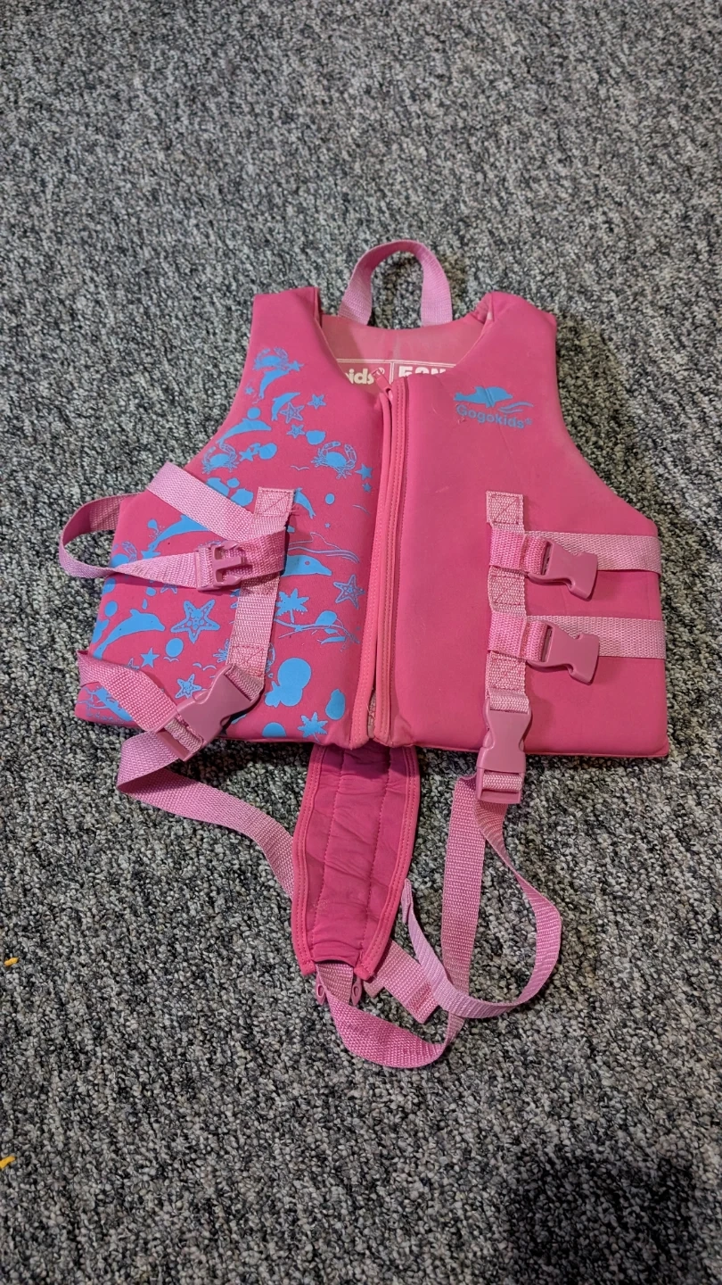This is a Gogokids 50N life jacket in pink! It's in great condition and perfect for keeping your little one safe in the water. The date of manufacture is January 2020.