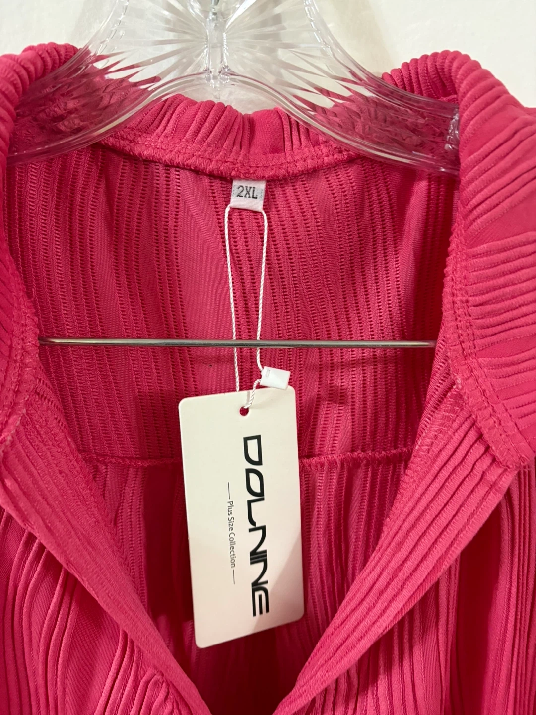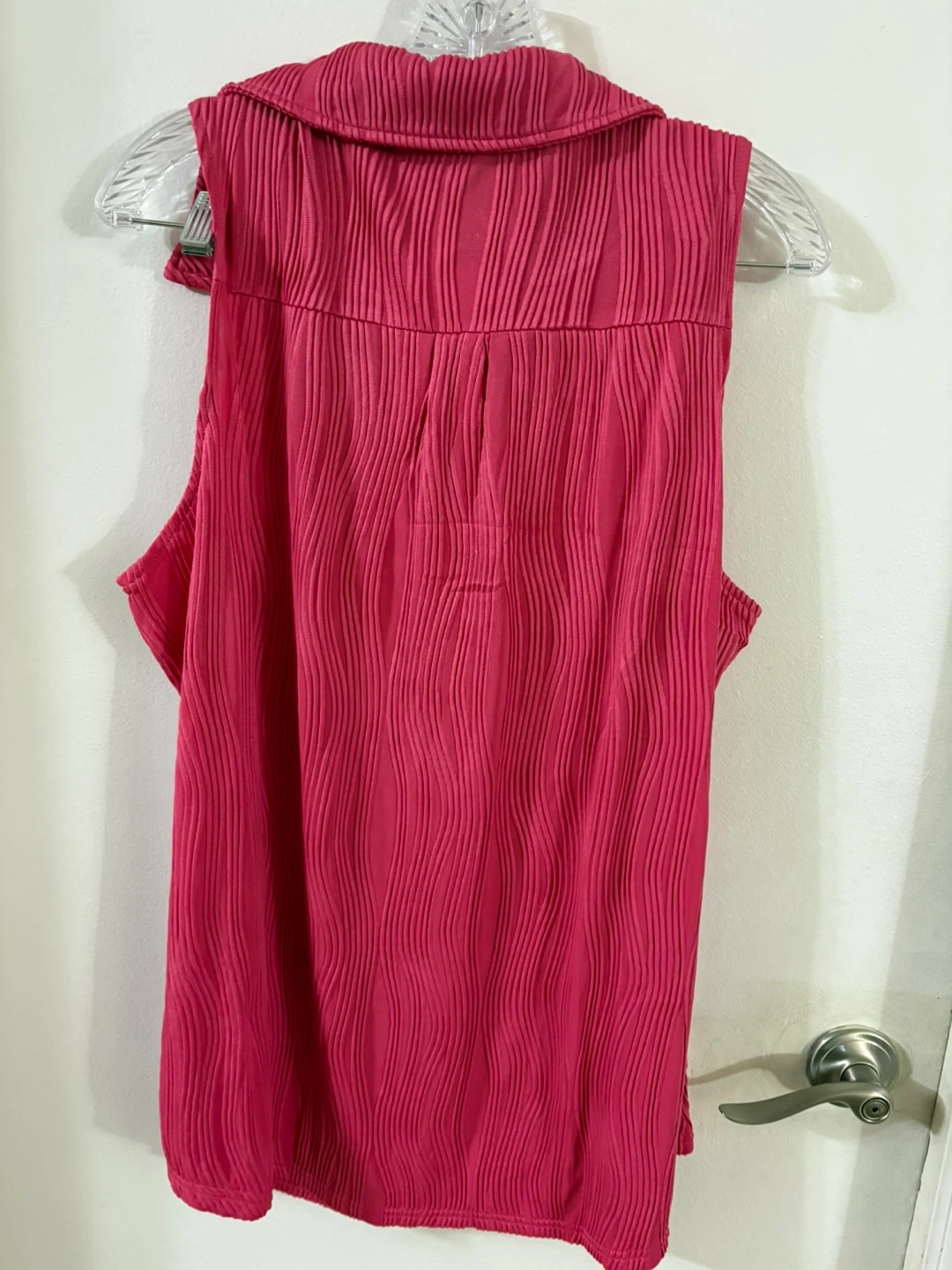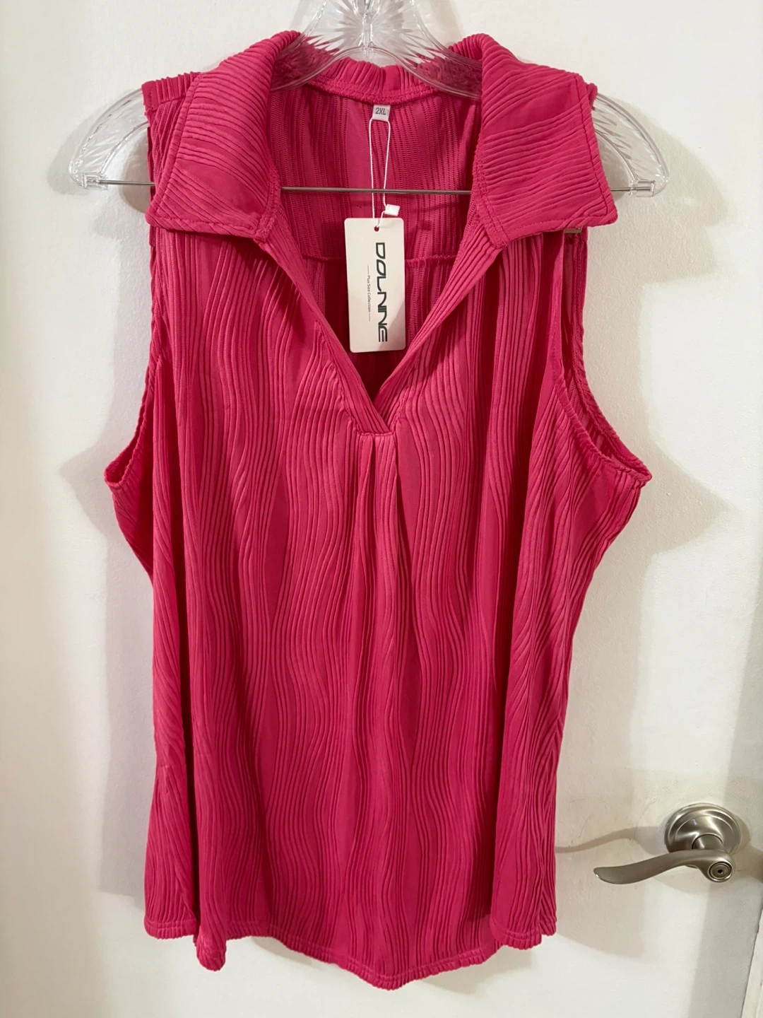 Here's a Dolinne sleeveless blouse in a vibrant pink color! It's a size 2XL and features a unique textured design. This blouse is perfect for adding a pop of color to your wardrobe .