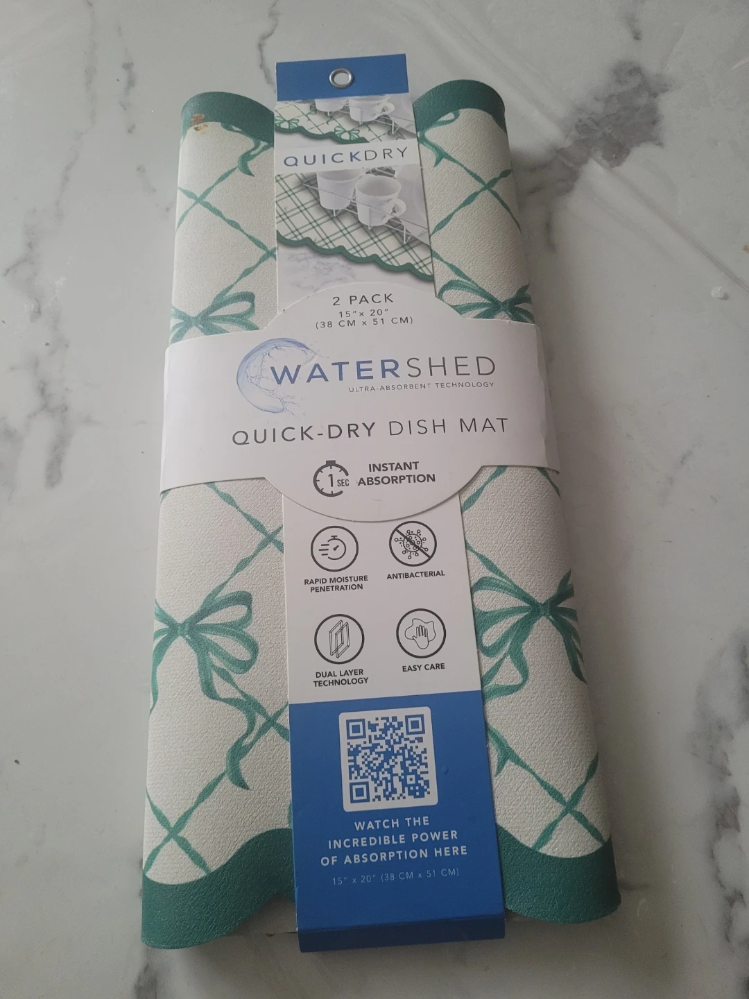 Selling a pack of two Watershed Quick-Dry Dish Mats! These mats feature ultra-absorbent technology for instant, 1-second absorption. They're designed with rapid moisture penetration and are antibacterial, plus they're easy to care for. Each mat measures 15" x 20" (38 cm x 51 cm).