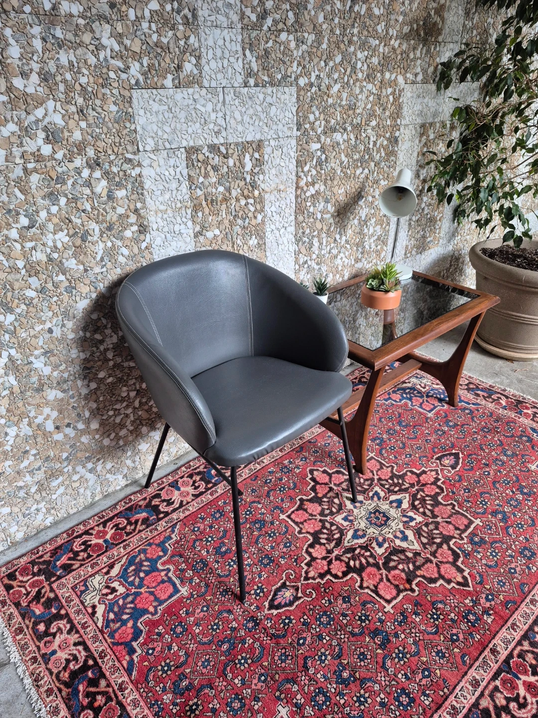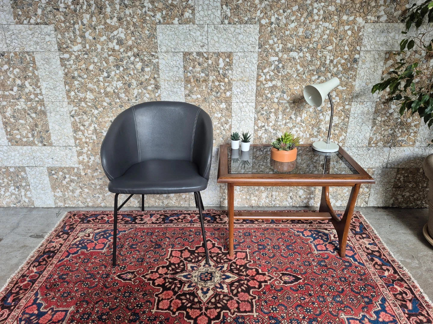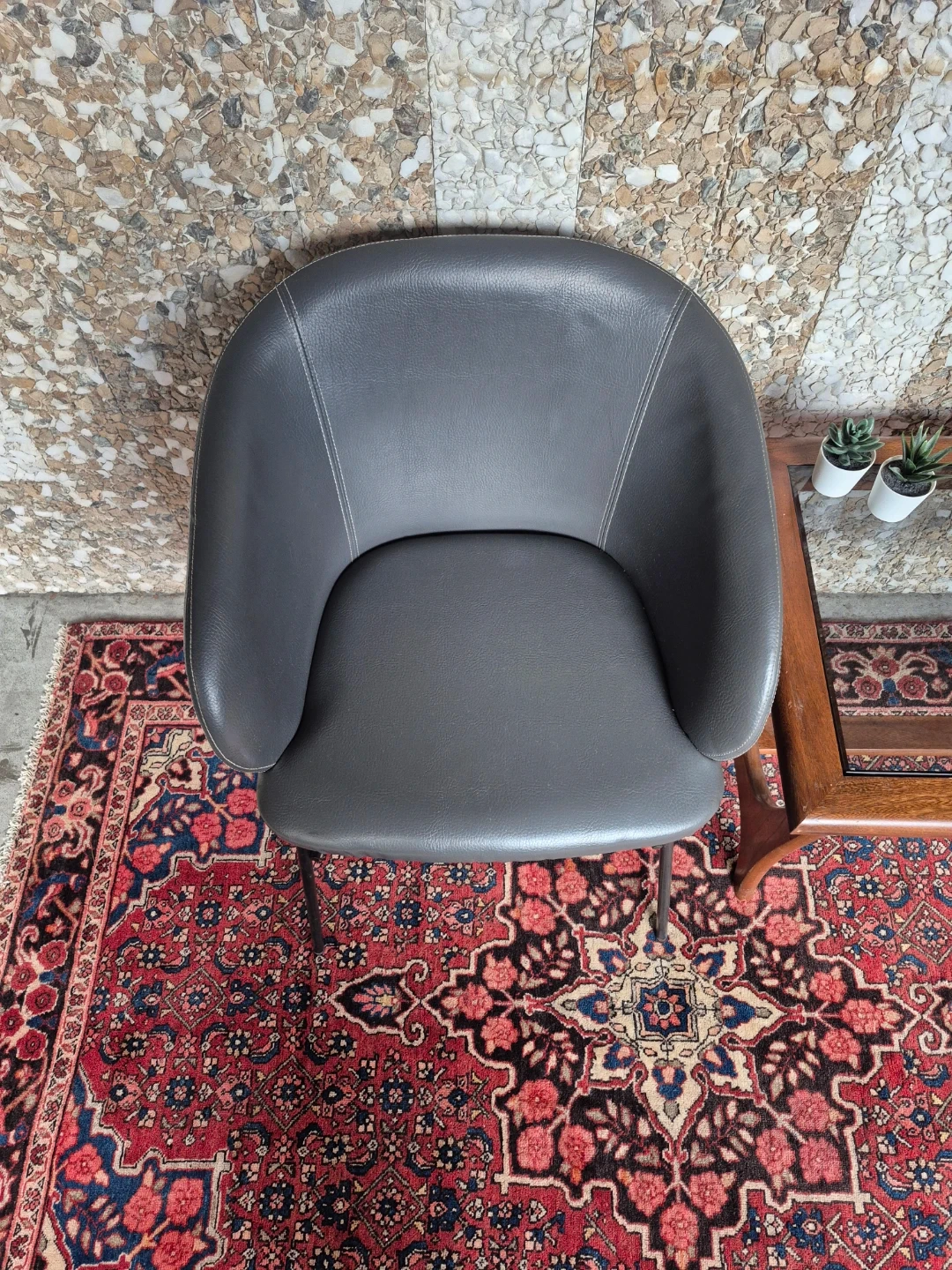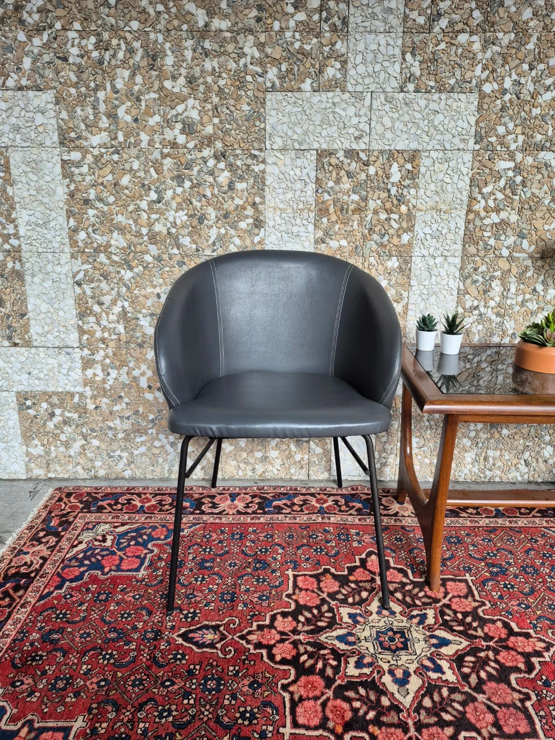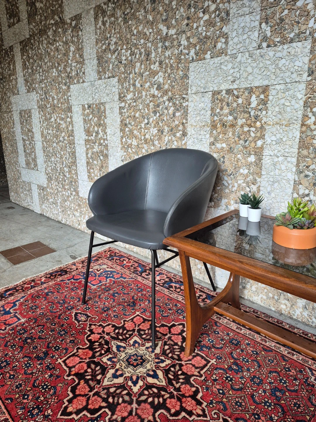 Modern accent chair upholstered in genuine dark grey leather with black metal legs. Comfortable curved back and padded seat. Solid and sturdy with no rips or damage. Clean and ready to use. Great for living room office bedroom or waiting area.