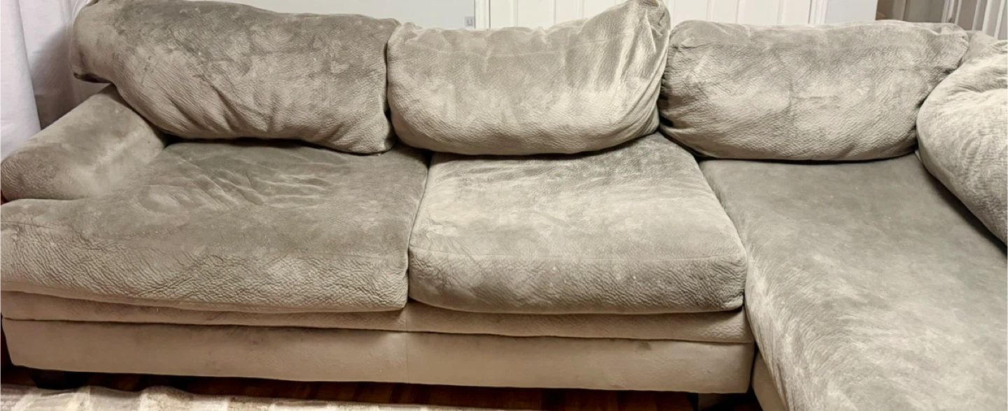 Selling a comfy grey sectional sofa! It's gently used and has lots of life left. Perfect for a living room or family room. The material is soft and inviting, great for lounging and relaxing after a long day