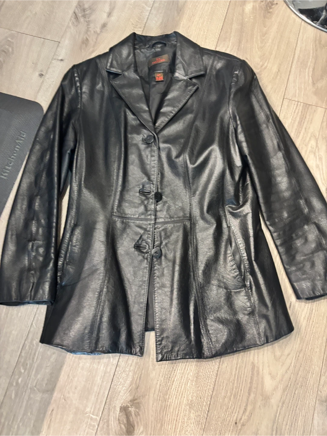 Selling a stylish black leather jacket from Danier, size uk 12-14. It's in great condition and ready for a new owner!