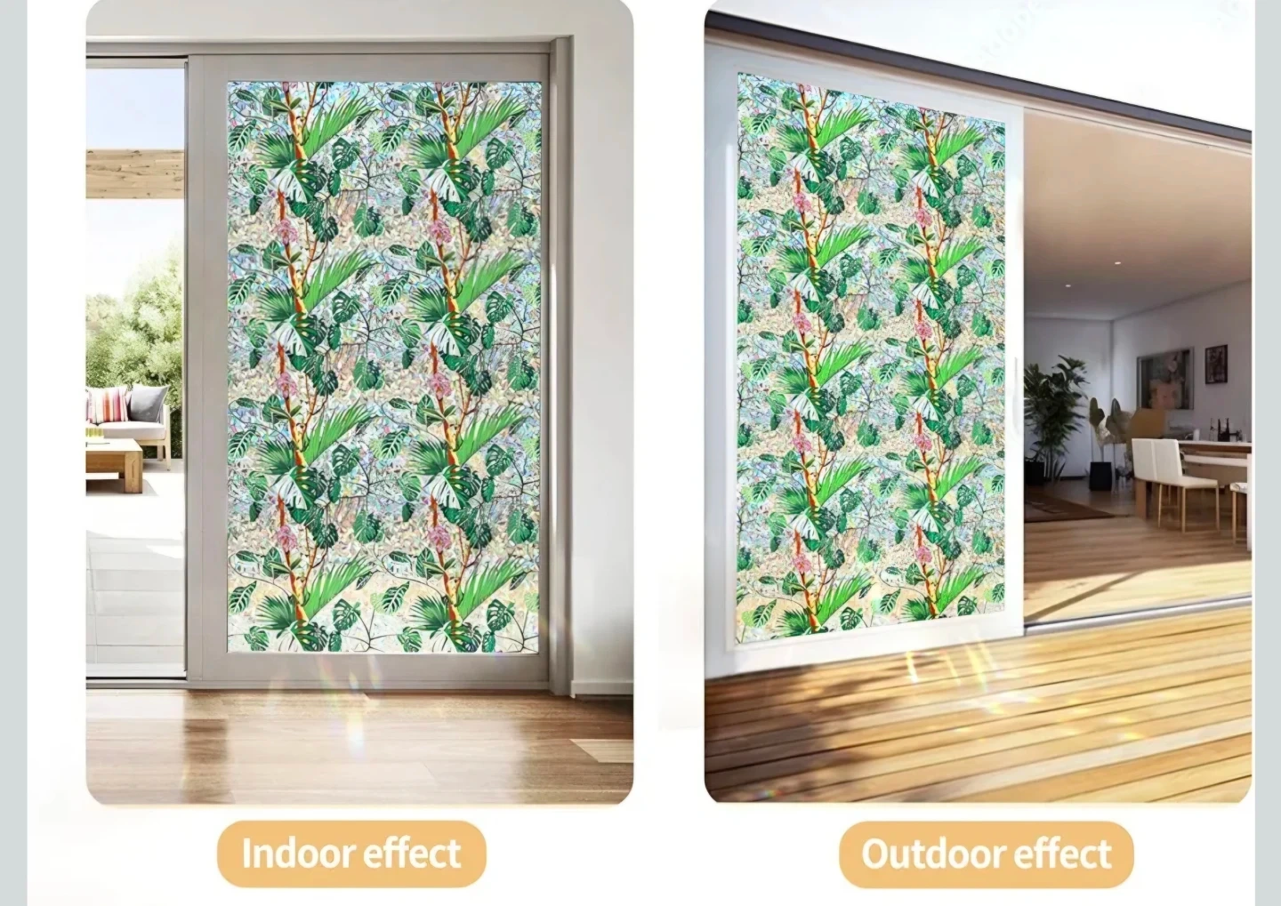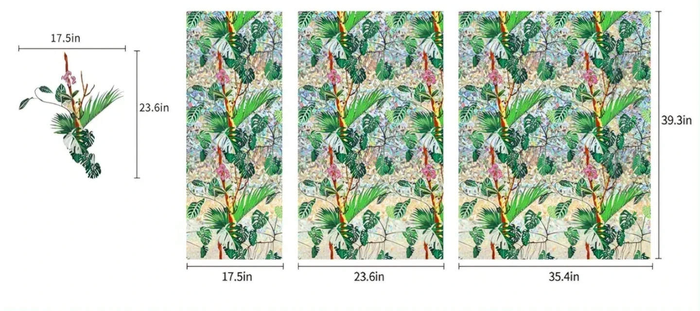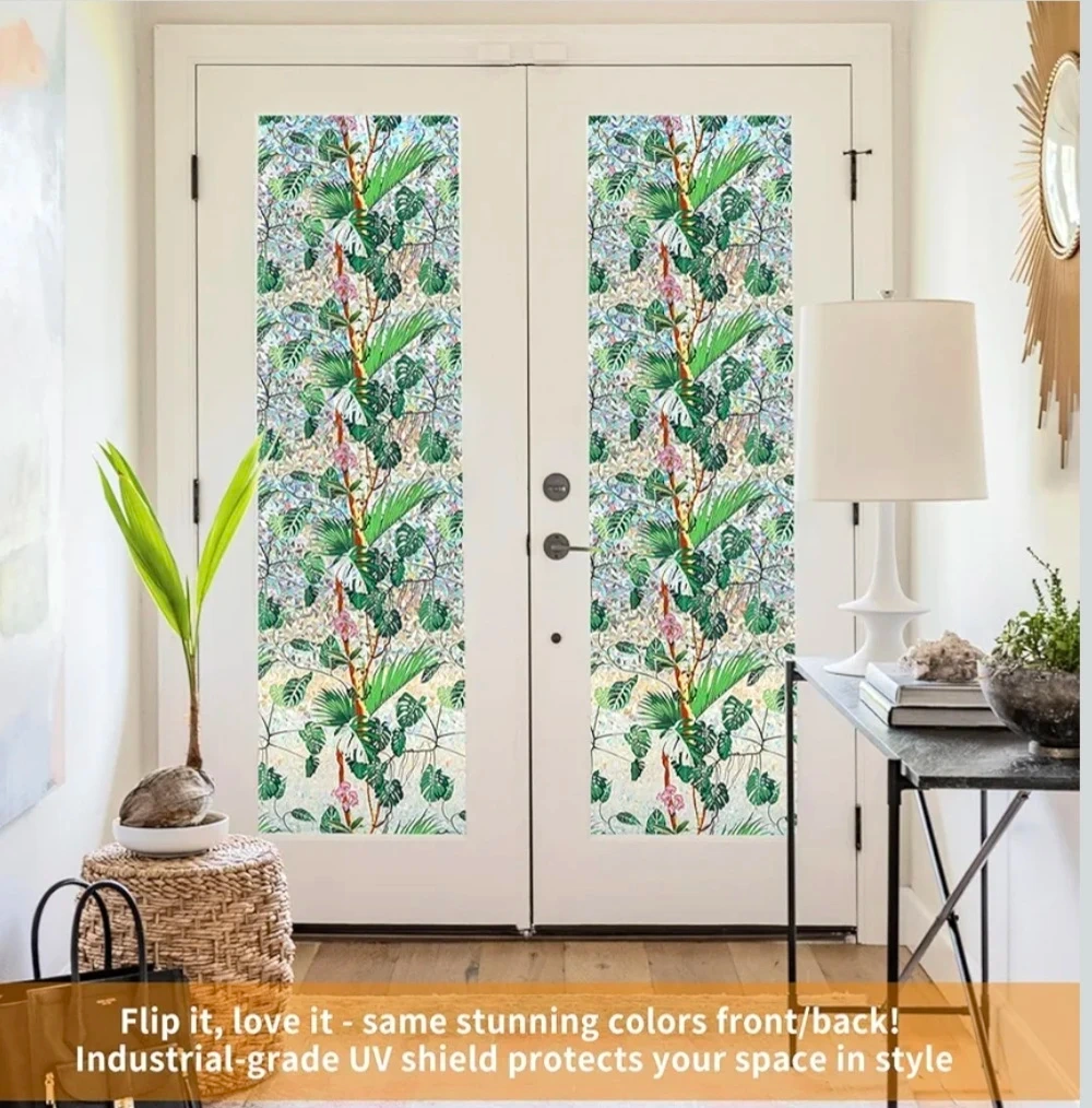This window film features a beautiful tropical plants design. New. It's perfect for adding some privacy and style to your windows or doors. The film has stunning colours on both sides. Reusable. 17.5"x78.7"