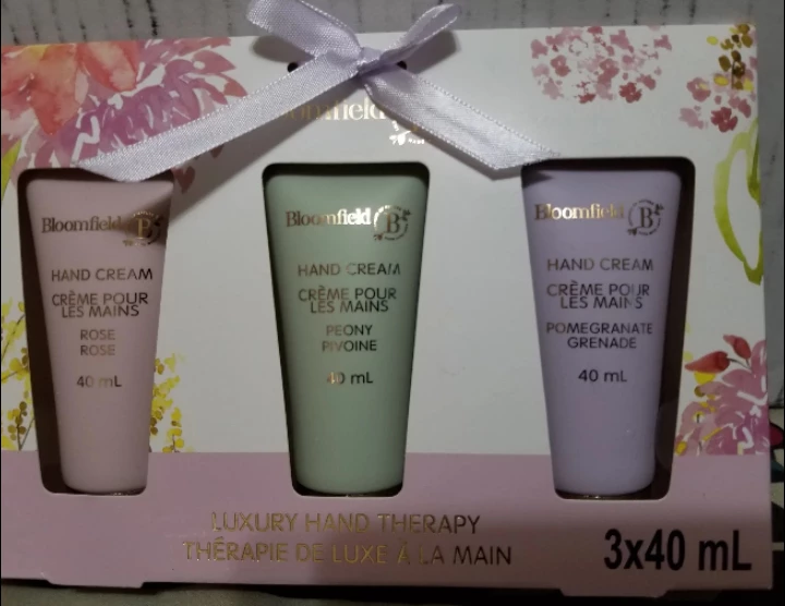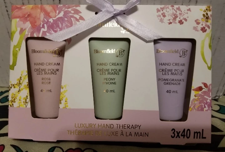 Some luxurious hand care with this Bloomfield hand cream set! It includes three 40mL tubes in Rose, Peony, and Pomegranate scents. Perfect for keeping your hands moisturized and smelling lovely.