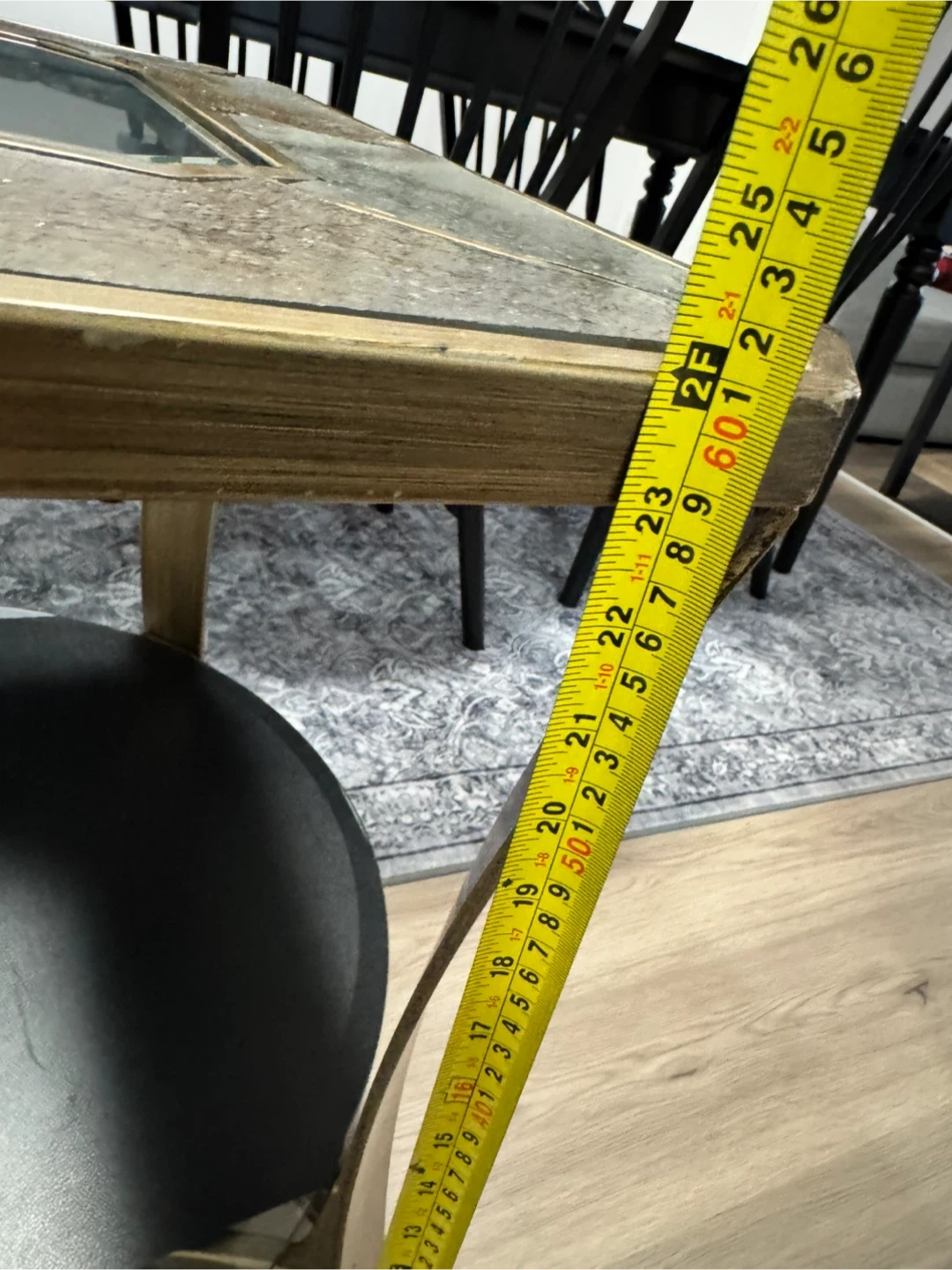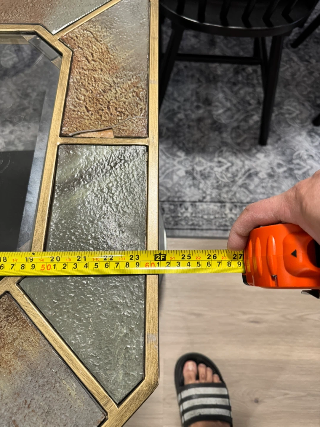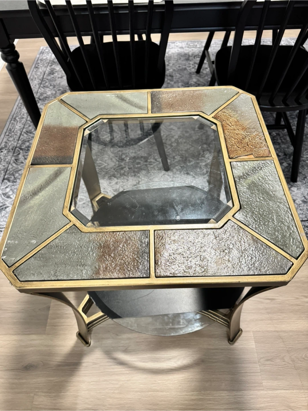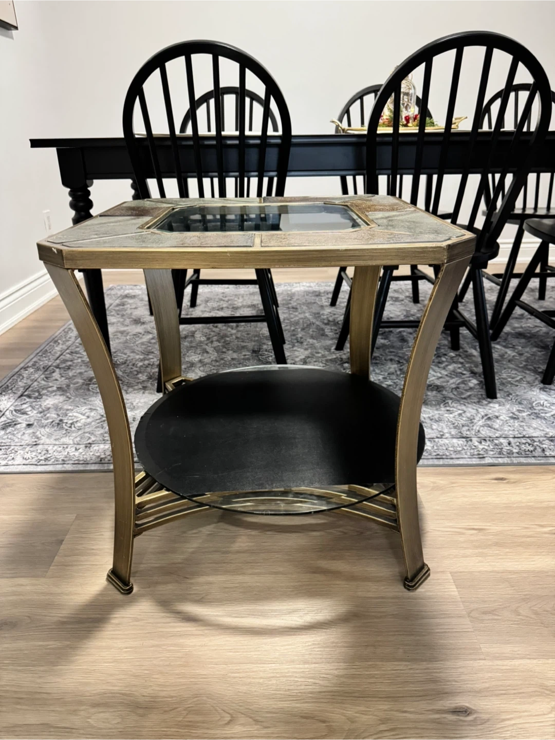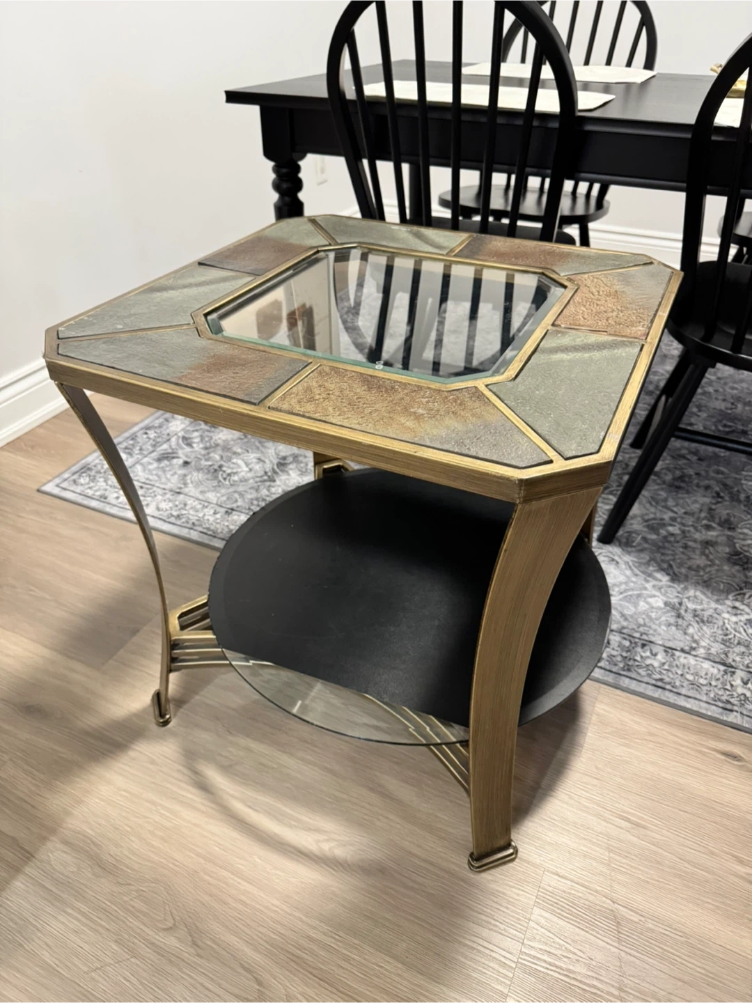 This classic beautiful table features a glass top surrounded by decorative stone-look tiles and a lower shelf. It's about 24 inches wide and would be a nice addition to any living space!