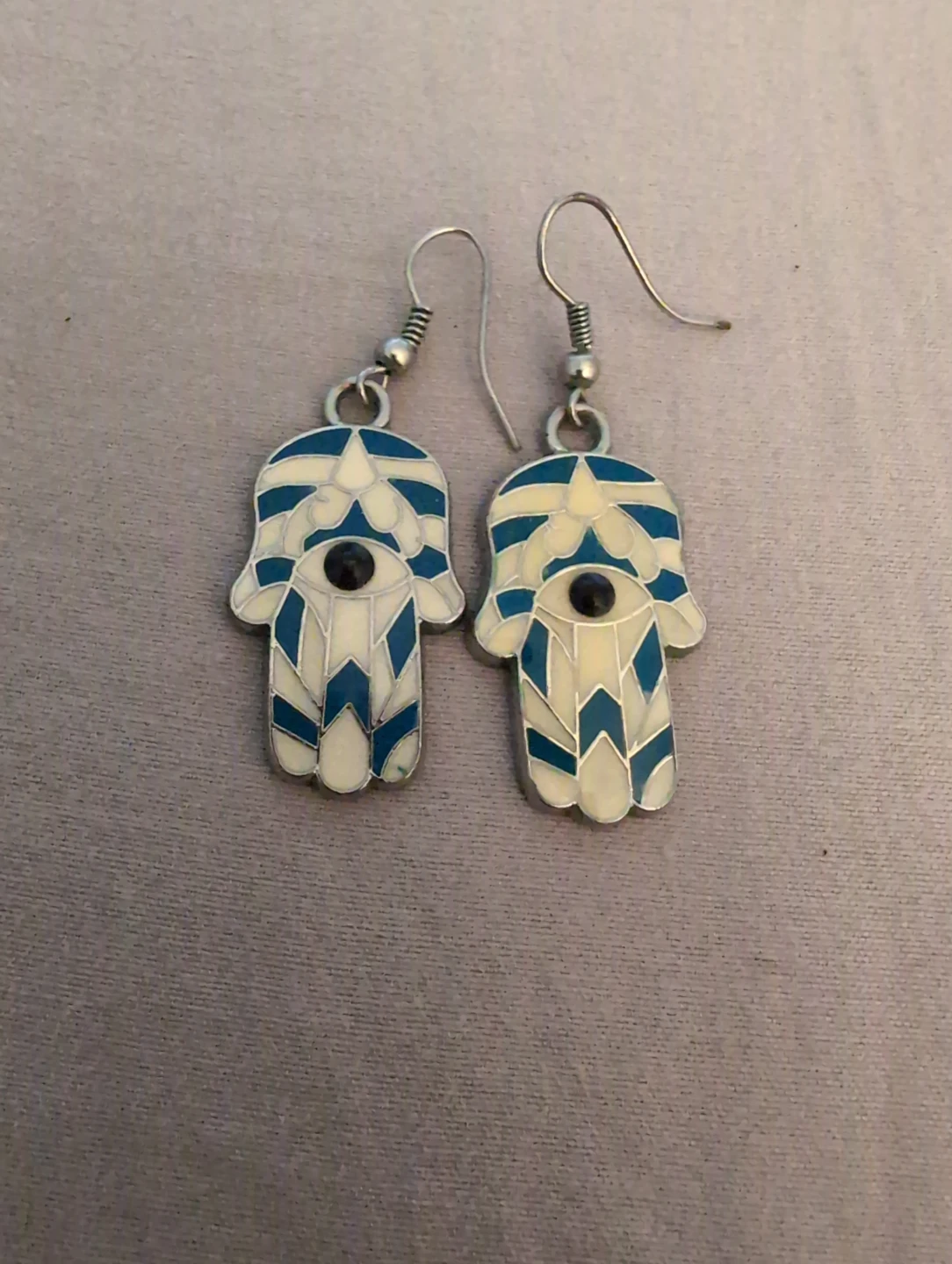 Cute pair of Hamsa hand earrings! They feature a blue and white design with a black centre. Perfect for adding a touch of style to any outfit
