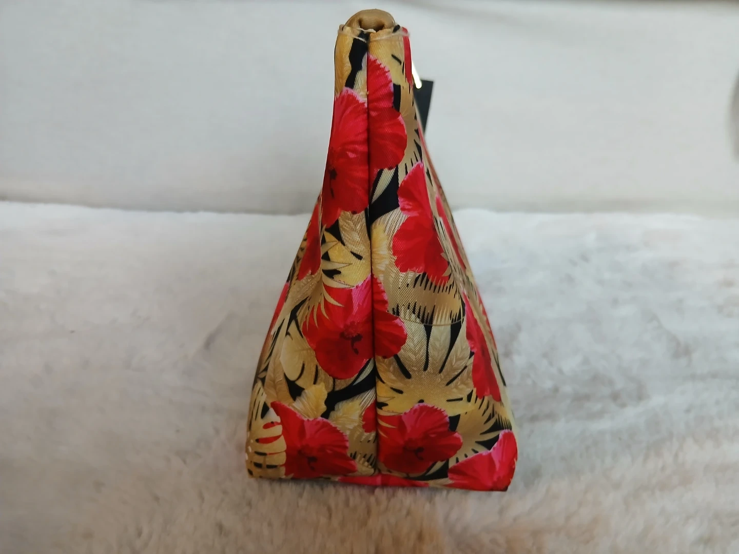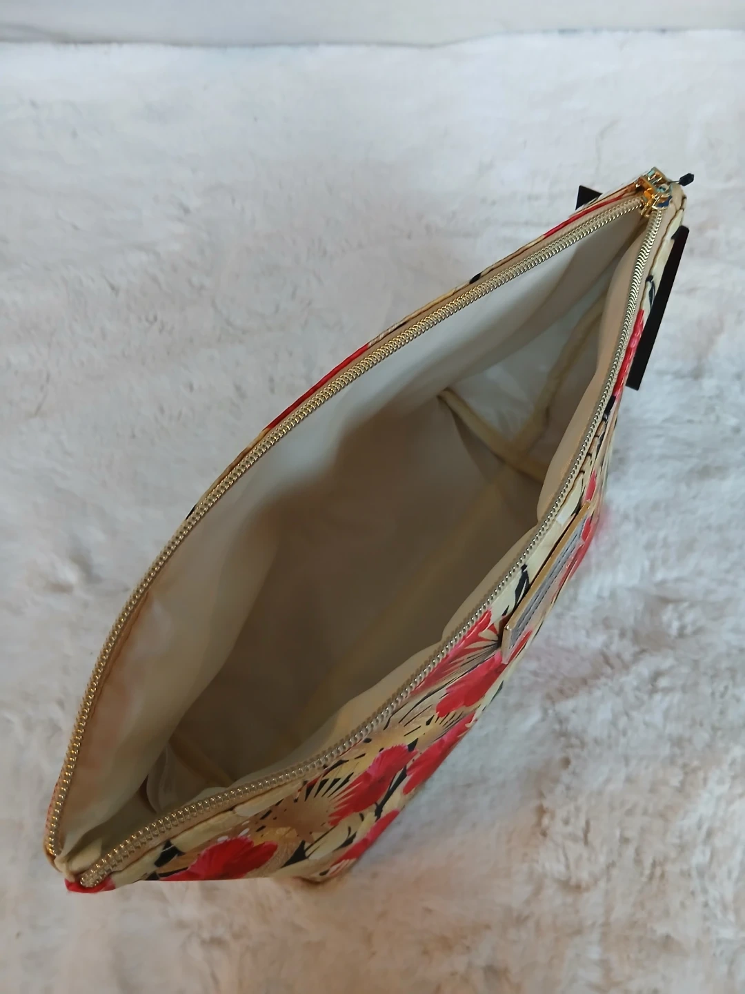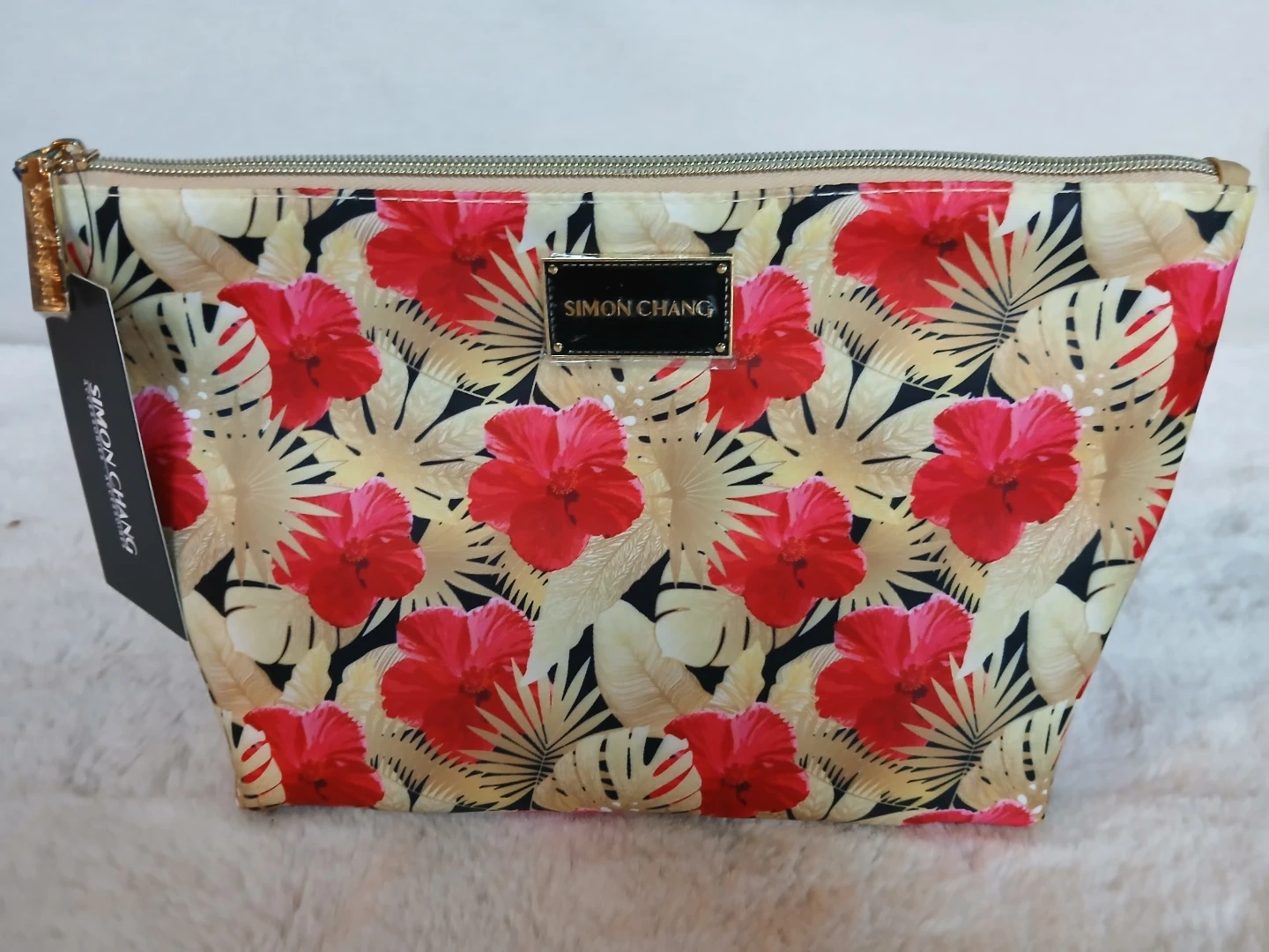 This is a large, beautiful cosmetic bag with a vibrant floral print, by Canadian Designer, SIMON CHANG.