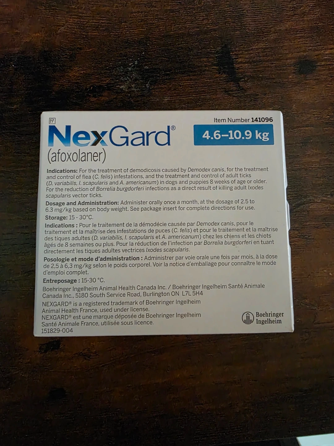 Selling a box of NexGard chewable tablets for dogs, suitable for dogs weighing between 4.6-10.9 kg. These soft beef-flavoured tablets provide flea and tick treatment and control. The expiration date is June 2026