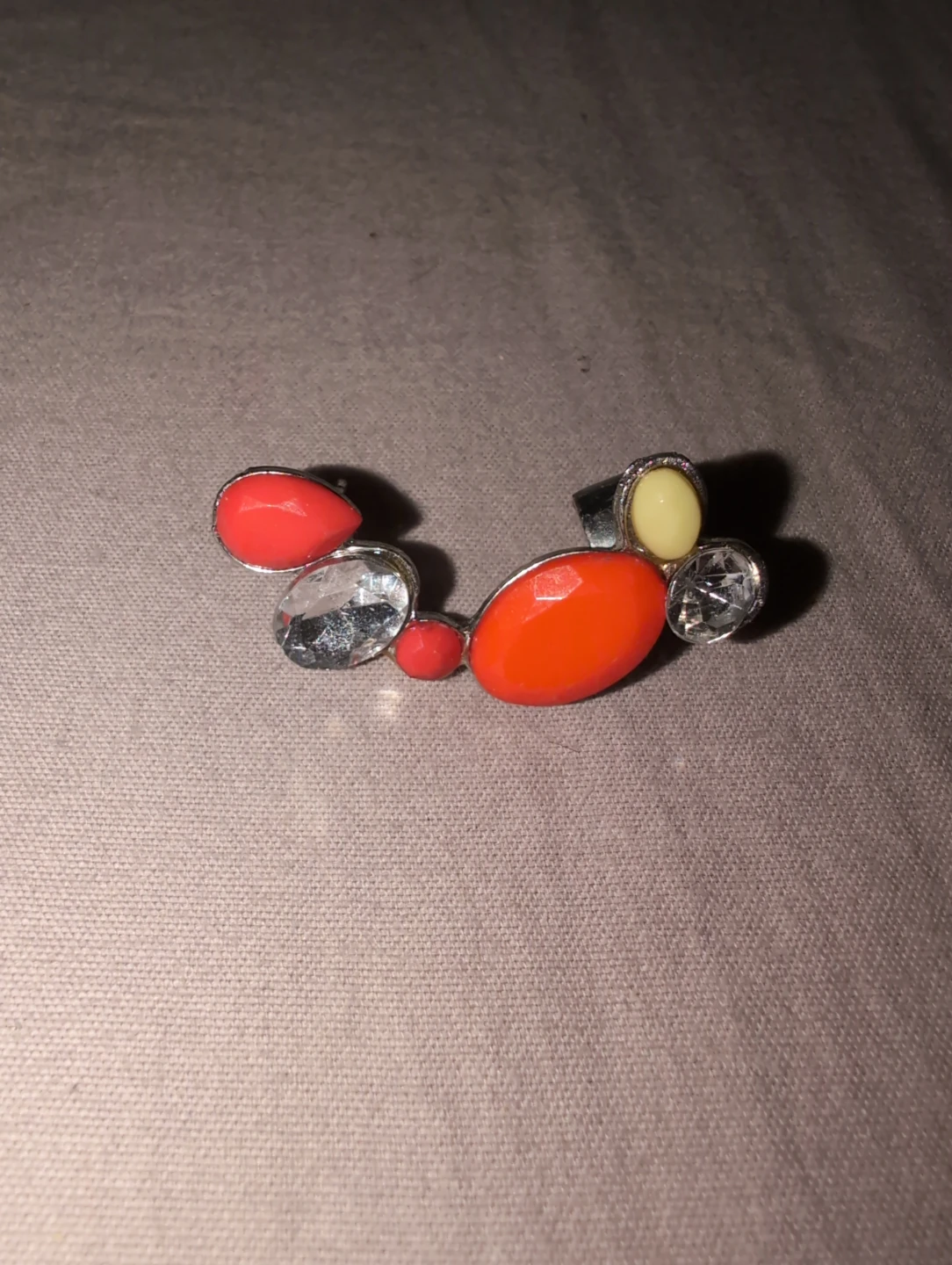 Selling a unique and colourful brooch! It features a variety of gemstones in different shapes and colours, including orange, clear, and yellow. It's in great condition and would add a fun pop of colour to any outfit