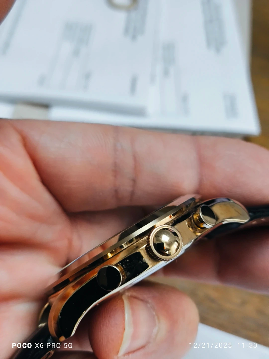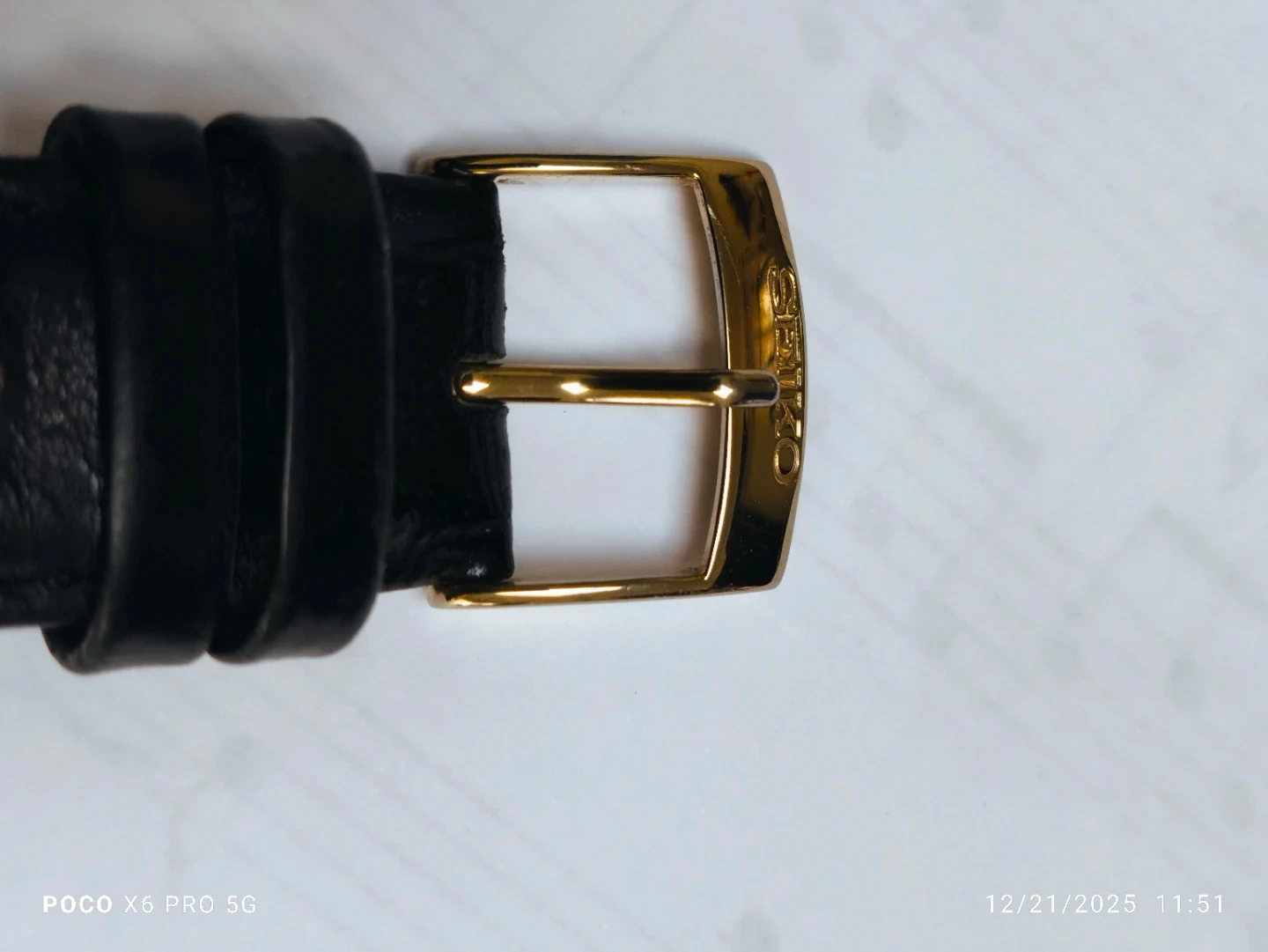 Selling a Seiko Chronograph watch, model 7T85-0A70. The watch has a gold-tone finish with a black leather strap. It's water-resistant to 10 bar and features a chronograph function. The original box and certificate are included!