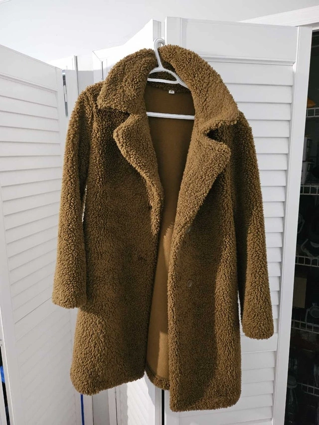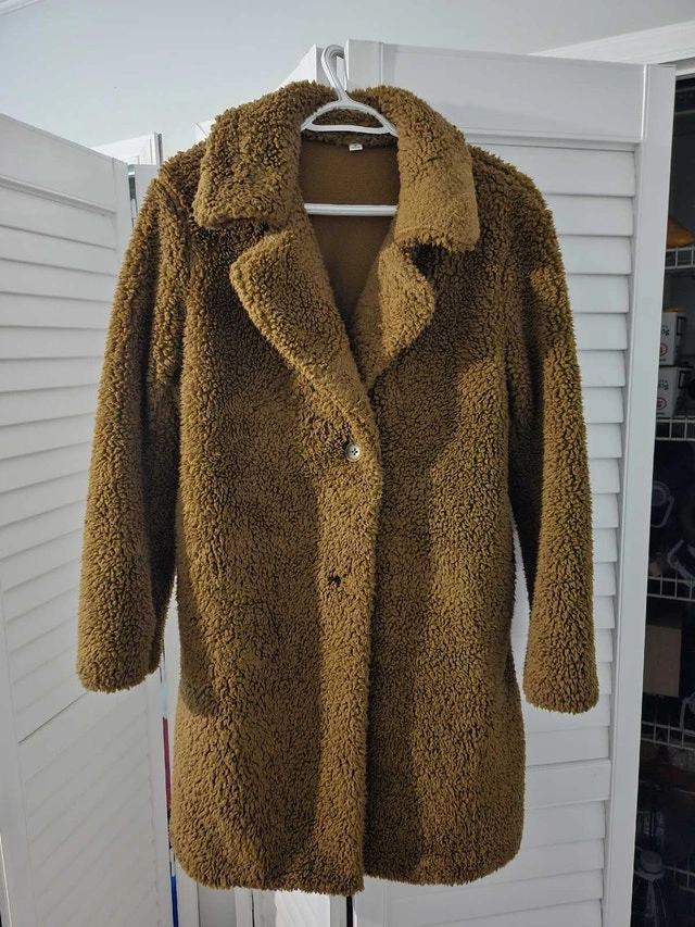 Women’s Uniqlo teddy fleece long coat in brown, size XS. Soft and warm with a relaxed, cozy fit. Lightly worn and in excellent condition — no stains, tears, or pilling. Perfect for fall and winter layering. Clean and ready to wear.