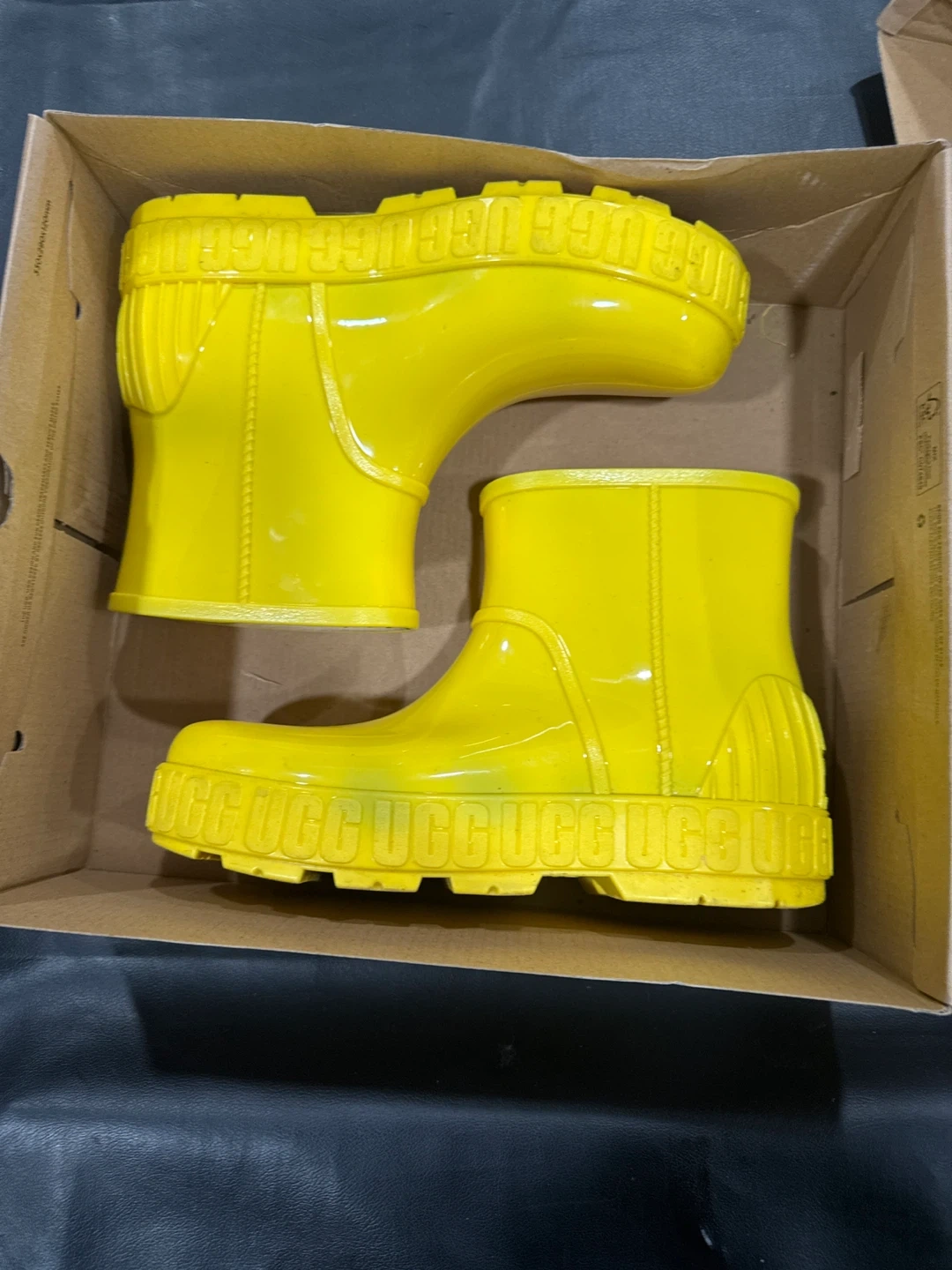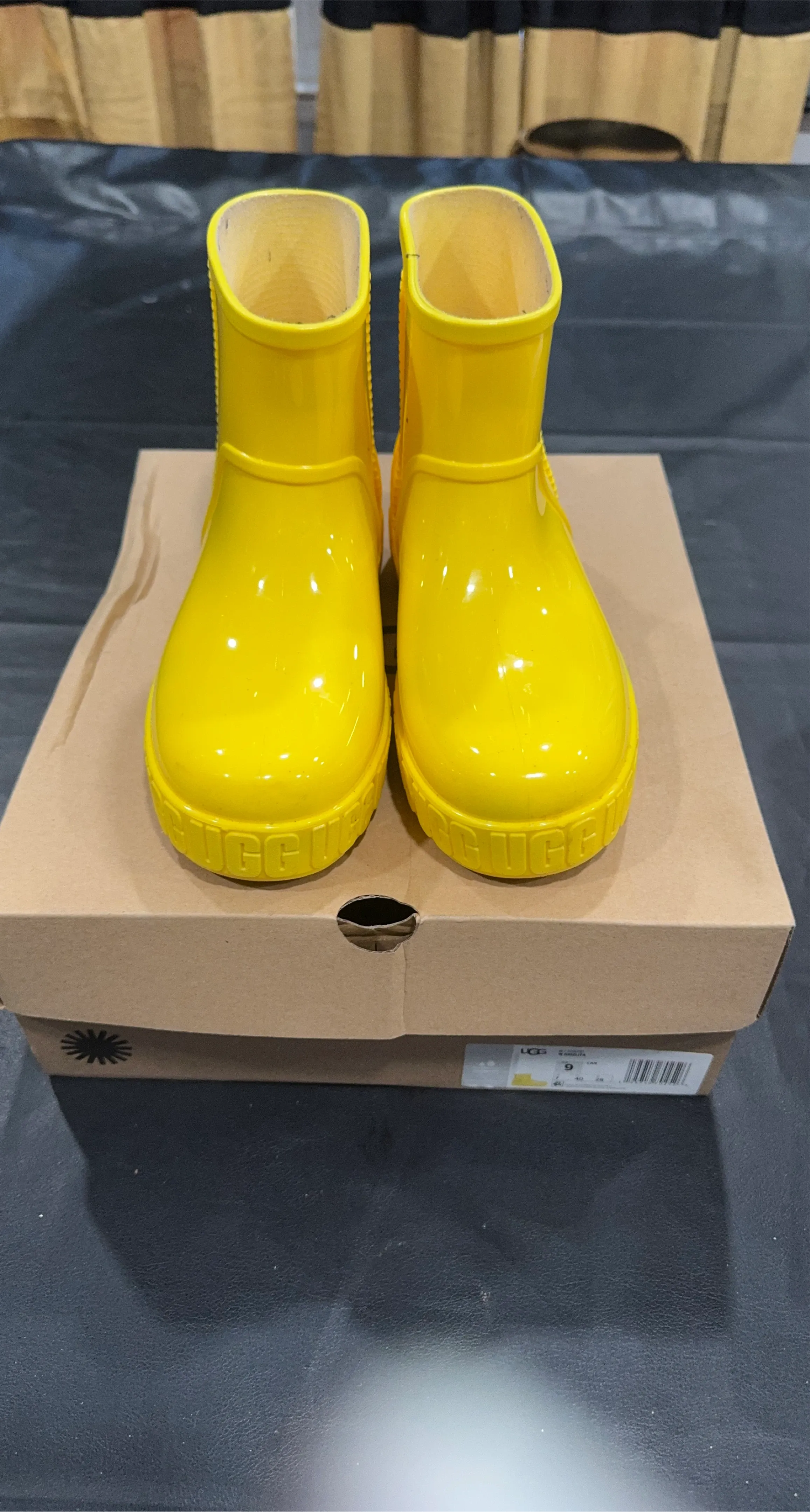 Selling a pair of UGG Girls' Droplet rain boots in a vibrant yellow color! These are size 9 and come with the original box. Perfect for keeping little feet dry and stylish on rainy days!