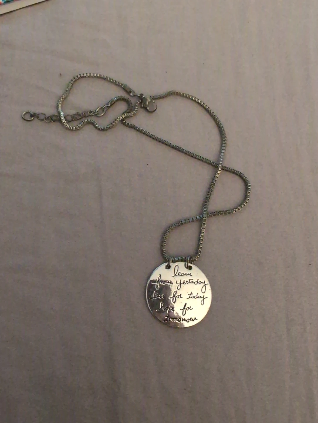 Selling a cute necklace! The pendant has the words 'learn from yesterday, live for today, hope for tomorrow' engraved on it. It's in great condition and ready for a new owner