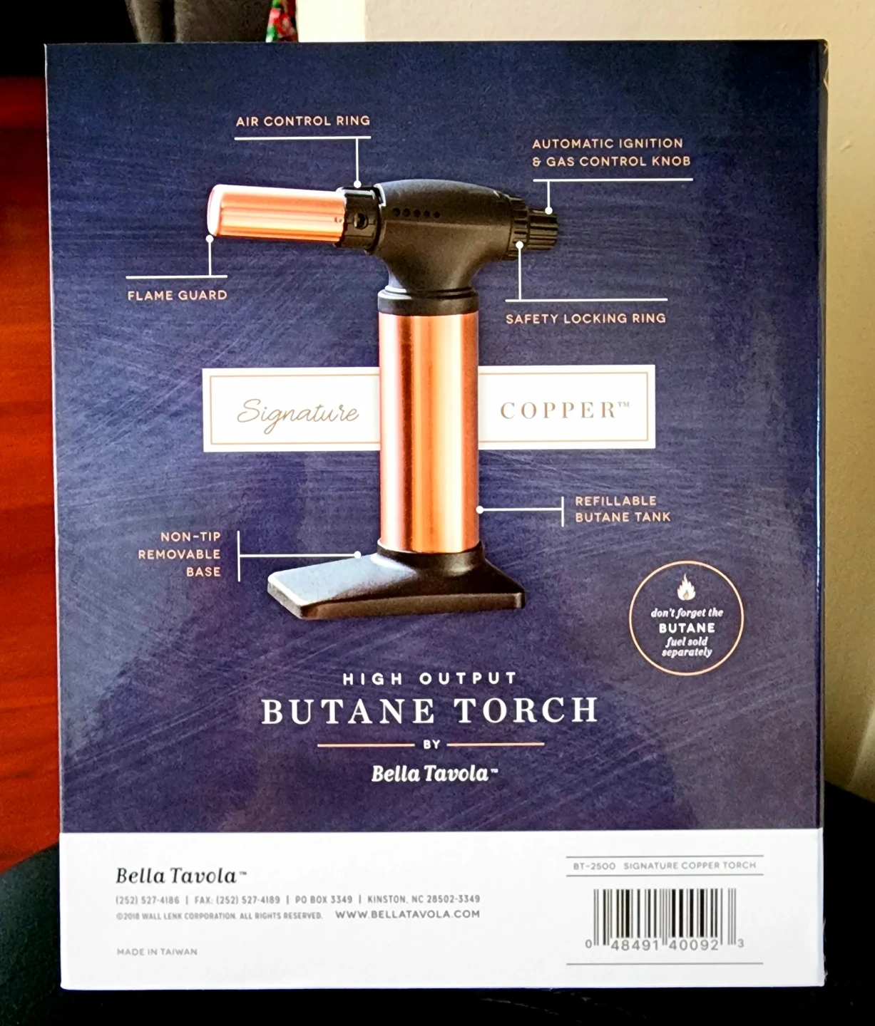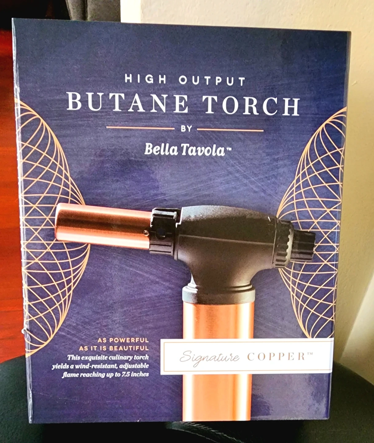 I'm selling a brand new Bella Tavola High Output Butane Torch! This culinary torch yields a wind-resistant, adjustable flame reaching up to 7.5 inches. It features automatic ignition and a gas control knob, along with a safety locking ring. The torch also has a non-tip removable base for added convenience.