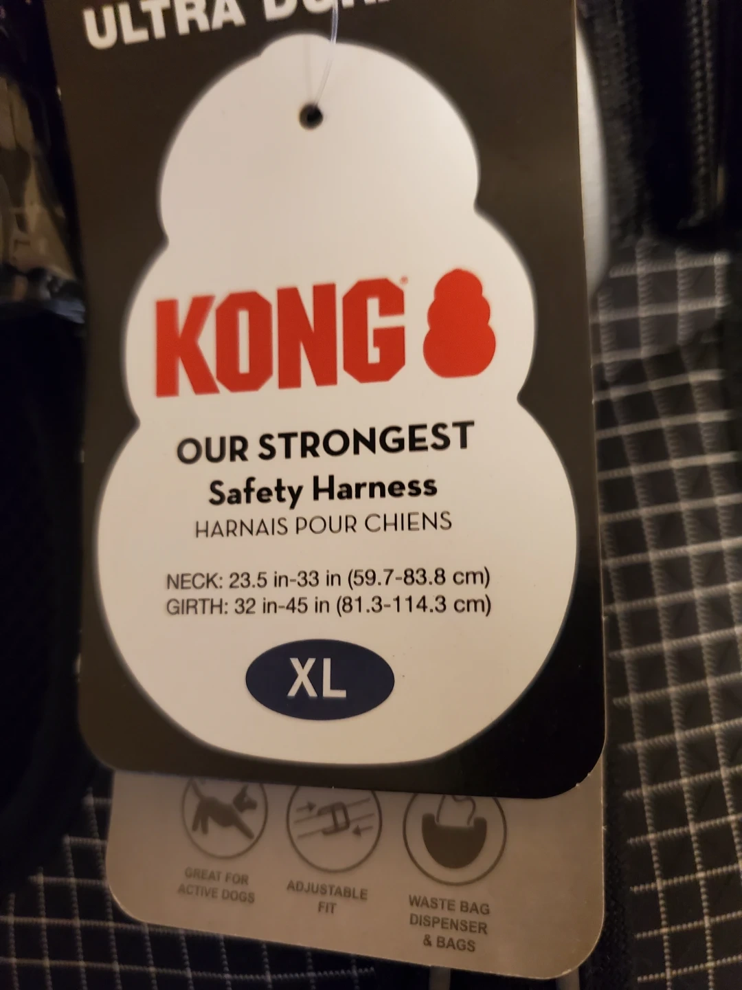 BNWT. This is a KONG Our Strongest Safety Harness for dogs, size XL. It fits neck sizes 23.5-33 inches (59.7-83.8 cm) and girth sizes 32-45 inches (81.3-114.3 cm). Great for active dogs and adjustable fit, plus it has a waste bag dispenser and bags. Pick up only near St Clair and Victoria Park.